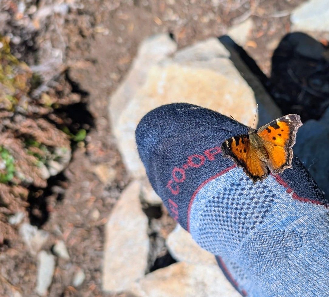 Morgens früh noch einmal an der Trail Magic vorbei. Aber nein, wir nehmen nichts mit. Unsere Proviantbeutel sind noch gut gefüllt. Nach 90 Minuten erreichen wir das Wasser, welches gestern so weit entfernt schien. MacGyver hat uns bereits vorgewarnt : Moskito-Hölle. Wir füllen nur unsere Flaschen und suchen uns einen besseren Platz. Um uns herum fliegen Hunderte von Schmetterlingen. Alles eine Sorte, der Kalifornische Schwalbenschwanz. Die sind wohl gerade eben erst geschlüpft.