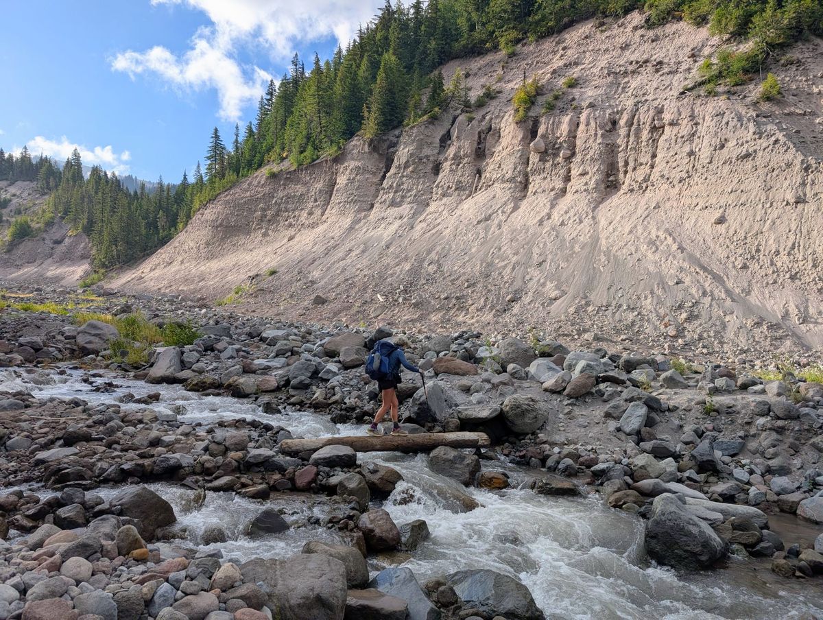 Vor uns liegt plötzlich ein Hindernis, von dem wir nichts geahnt haben. Muddy Fork muss überquert werden. Der ist von gräulicher Farbe, denn es handelt sich um Gletscherwasser vom Mount Hood. Ich höre das Wasser schon von Weitem rauschen und denke : „Oh nein, bitte heute kein river crossing mehr !“ Aber doch …. Ein dicker Baumstamm liegt von einem Ufer zum anderen und dient als Brücke über den Fluss. Mag ich gar nicht mehr gerne heute. Es ist schon 18.00 Uhr. Wir haben bereits 30 Kilometer in den Knochen. Mein Rucksack macht mich fertig. Der ist viel zu schwer, außerdem gerade noch beim letzten Bach 2 Liter Wasser zum Kochen drauf gepackt. Aber muss ja. Tief Luft holen und konzentrieren. Baumstamm-Balancieren mit Gepäck wird nie mein Lieblingssport. Aber geschafft, wir sind trocken über den Muddy Fork.