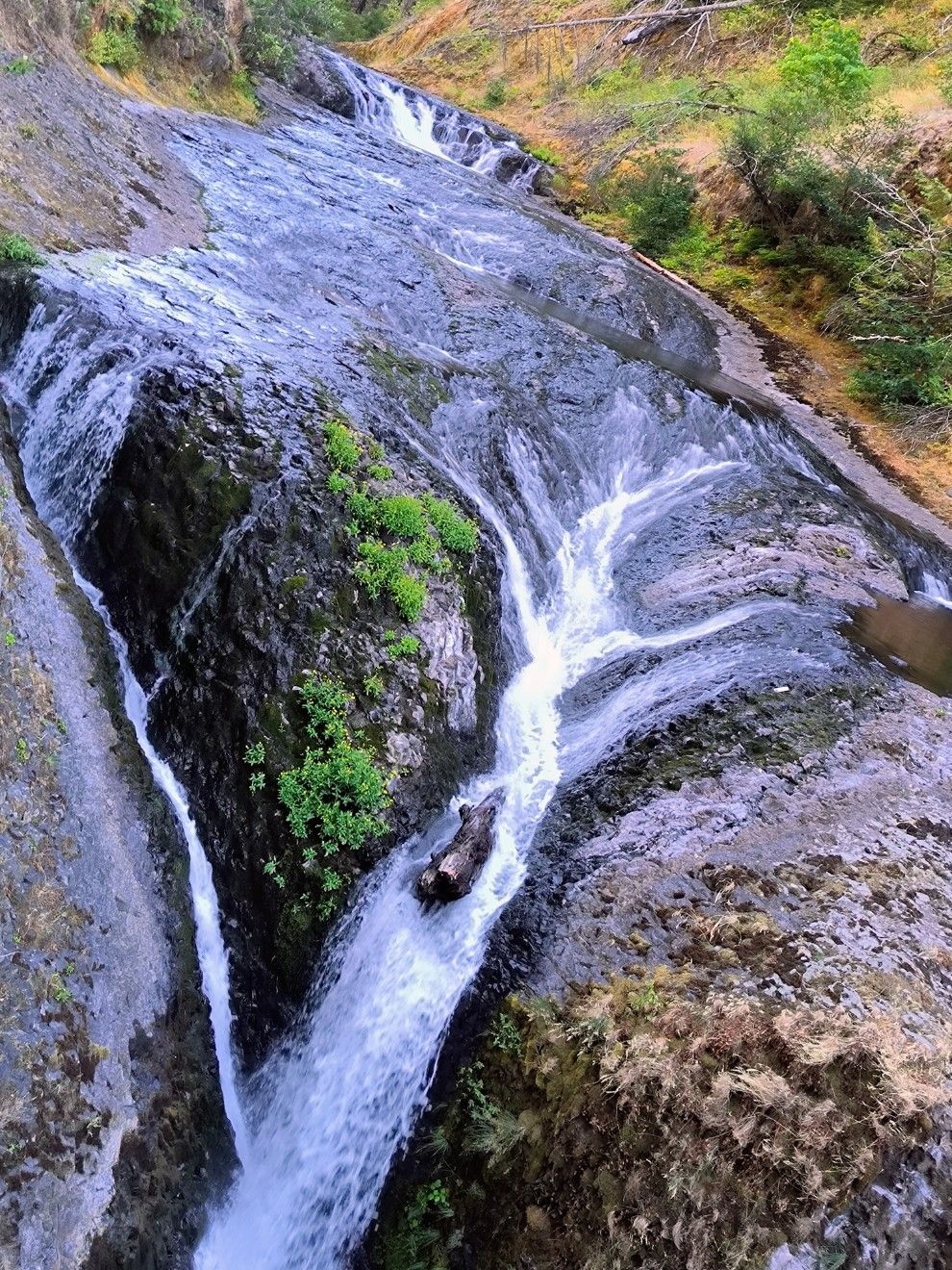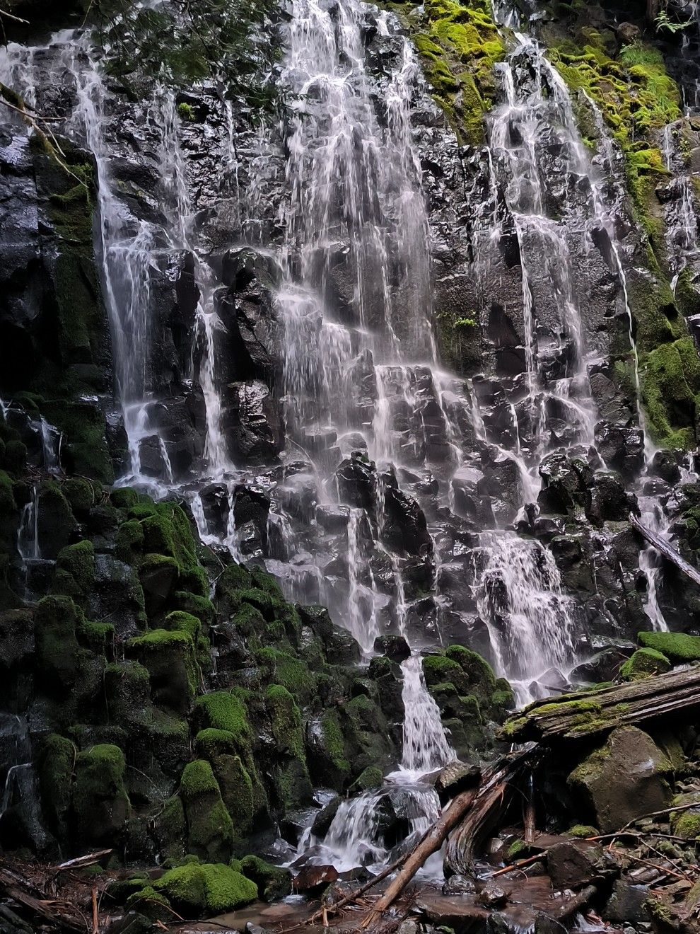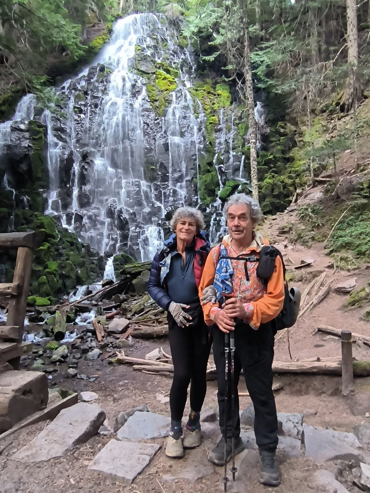 Gleich dahinter beginnt der Ramona Falls Trail. Ein Drittel aller Hiker läuft diese Variante des PCT. Wir auch. Es sind nur etwa 3 Kilometer, aber es lohnt sich. Die Landschaft ist viel abwechslungsreicher als der Waldweg, von dem wir abgebogen sind. Weicher Sandboden unter den Füßen, rechts ein Bach, links steile Granitwände. Mehrere grob gezimmerte Brücken führen immer mal wieder über’s Wasser. Am Ende des Trails stürzen die Ramona Falls 40 Meter in die Tiefe. Dieser Wasserfall ist ganz anders als die gestrigen. Breit gefächert plätschert er in Kaskaden nach unten. Es gibt eine Brücke zum Überqueren, aber auch, um stehen zu bleiben und das Schauspiel zu genießen.