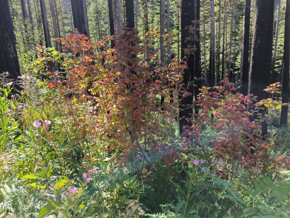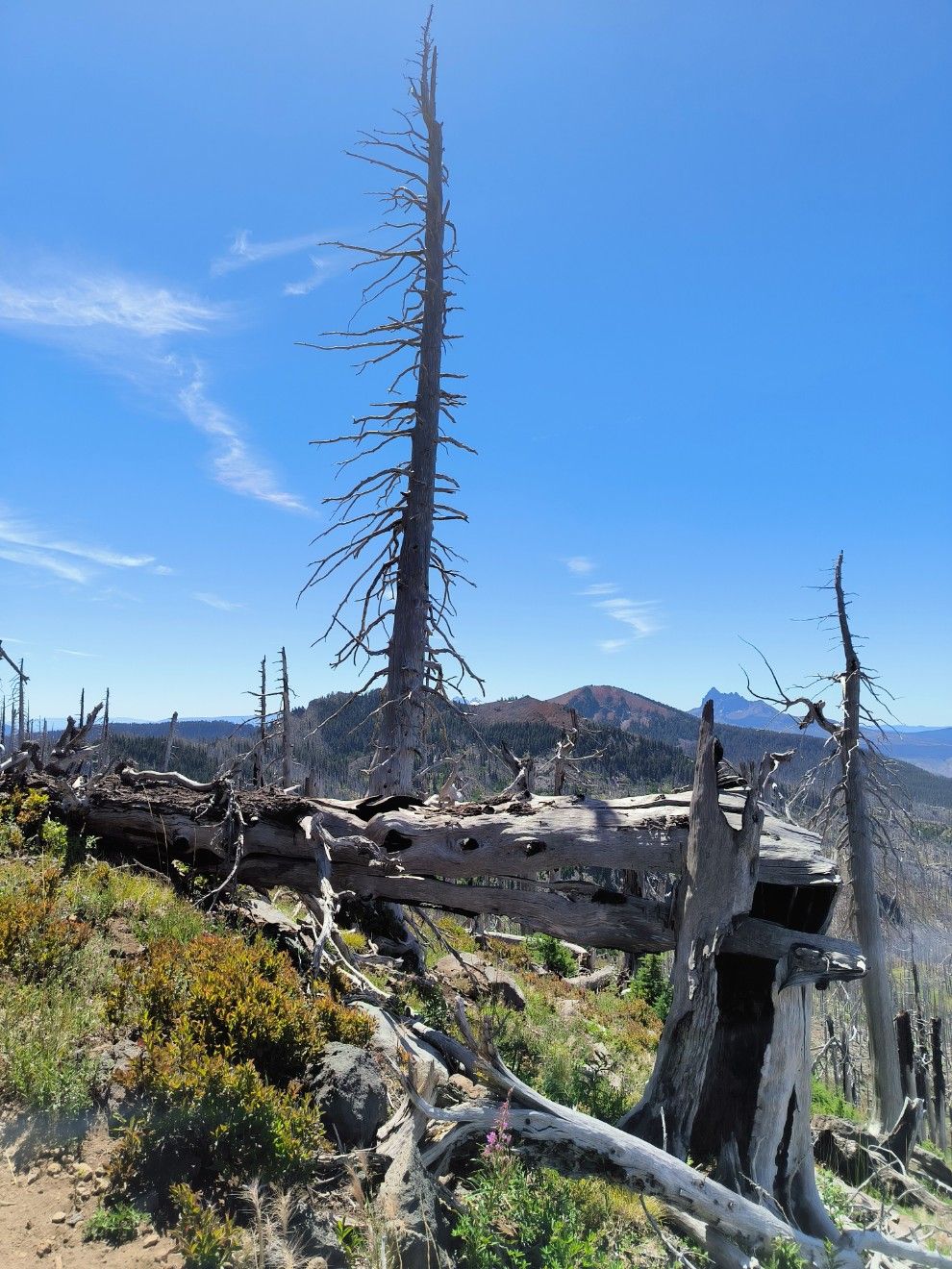 Um 9.30 Uhr klart es auf, das sieht vielversprechend aus. Der Trail wird rauer. Leckere Himbeeren gibt es. Ziemlich klein, aber unglaublich aromatisch. Durch Geröll und über Felsen steigen wir auf. Immer noch verbranntes Gebiet. In der verkohlten Landschaft reihen sich kleine und große Teiche aneinander. Wenn der Wind zwischen den toten Bäumen pfeift, dann erinnert es an das Geräusch im Jachthafen, wenn es zwischen den Masten heult.