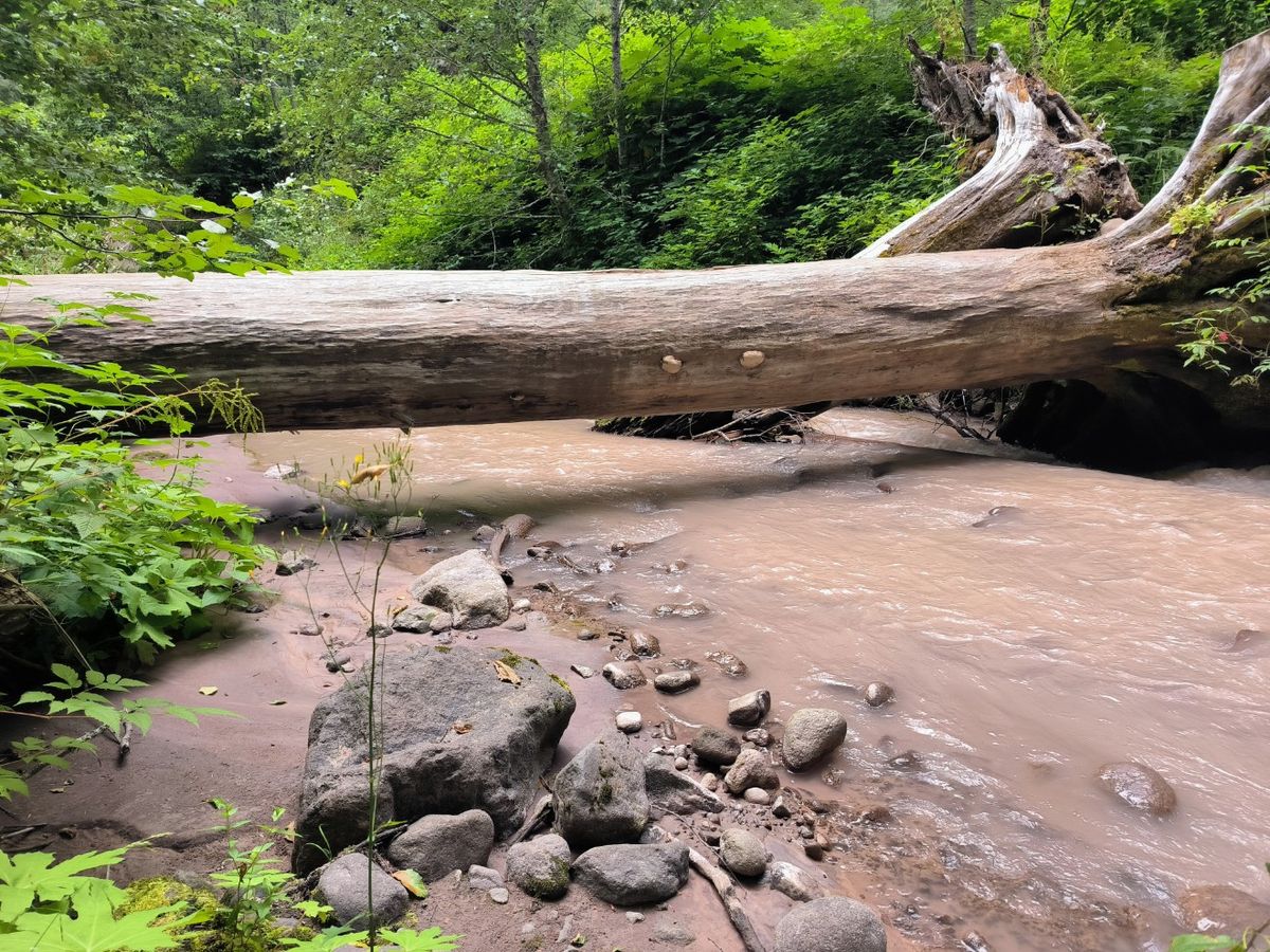 Okay, die Sache mit dem Frühstück in der Timberline Lodge haben wir abgehakt. Zu weit und zu viel Aufstieg. Dann laufen wir eben nur noch so lange weiter, bis wir einen guten Zeltplatz gefunden haben. Schon wieder hört es sich vor uns nach donnerndem Wasser an. Unser Pfad führt zu einem Fluss, der ebenfalls vom Gletscher des Mount Hood gespeist wird. Der Sandy River hat enorme Kraft. Das Wasser ist milchig trüb. Steine in allen Größen im Fluss, aber die Abstände sind groß, und es sieht sehr glitschig aus. Bei dieser starken Strömung möchten wir nicht fjorden. Ein dünner Baumstamm liegt von einem Ufer zum nächsten. Thomas macht einen Probeschritt, das ganze Ding wackelt und dreht sich. Ich fühle mich heute nicht mehr fit genug für jegliche Art von Akrobatik.