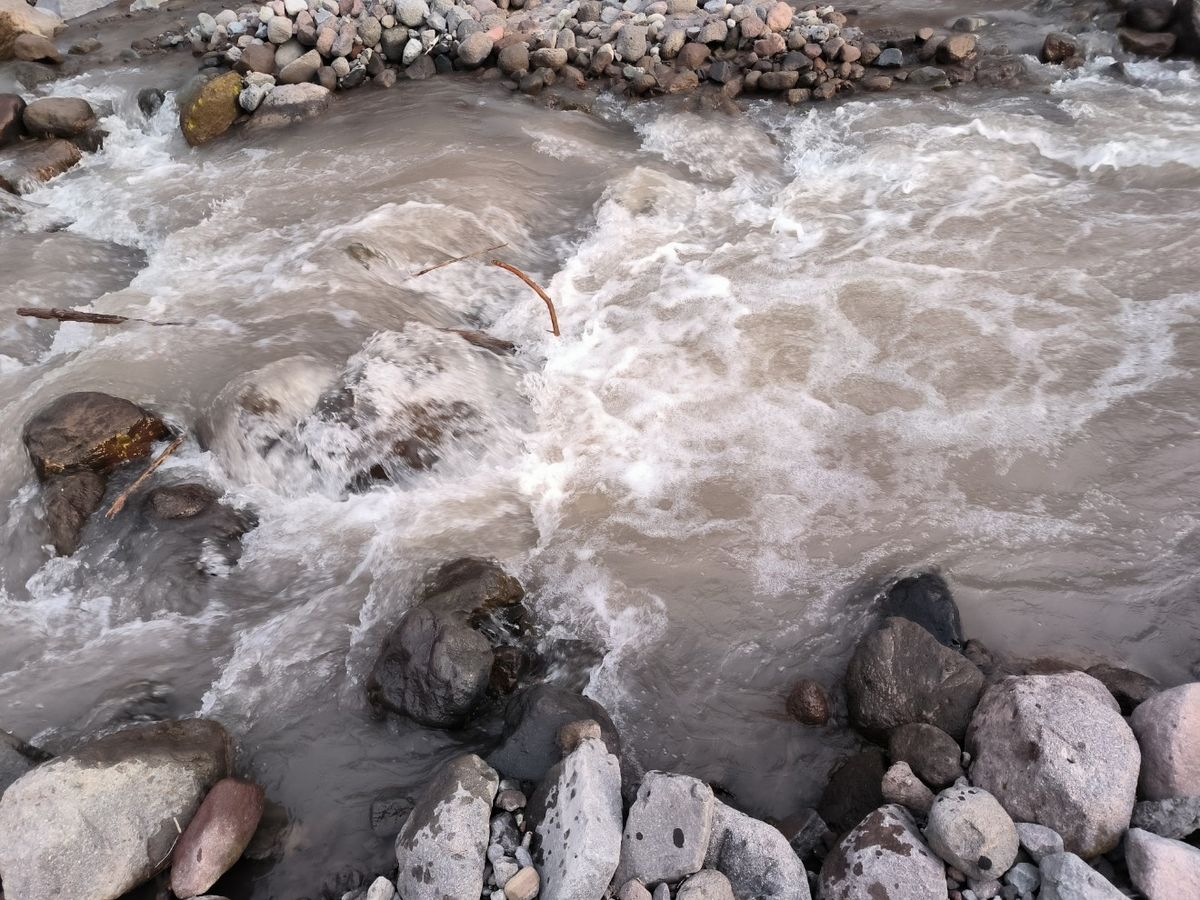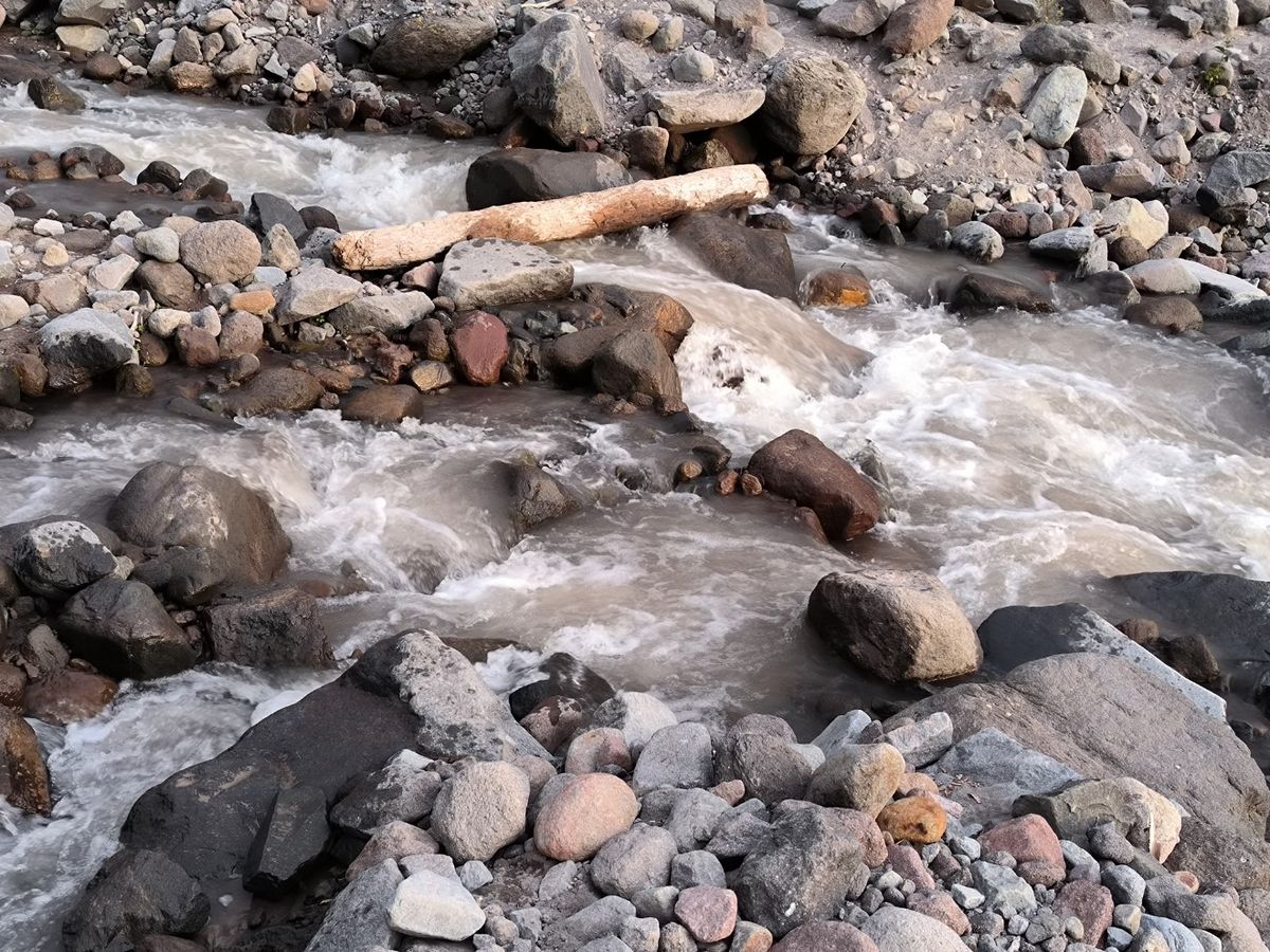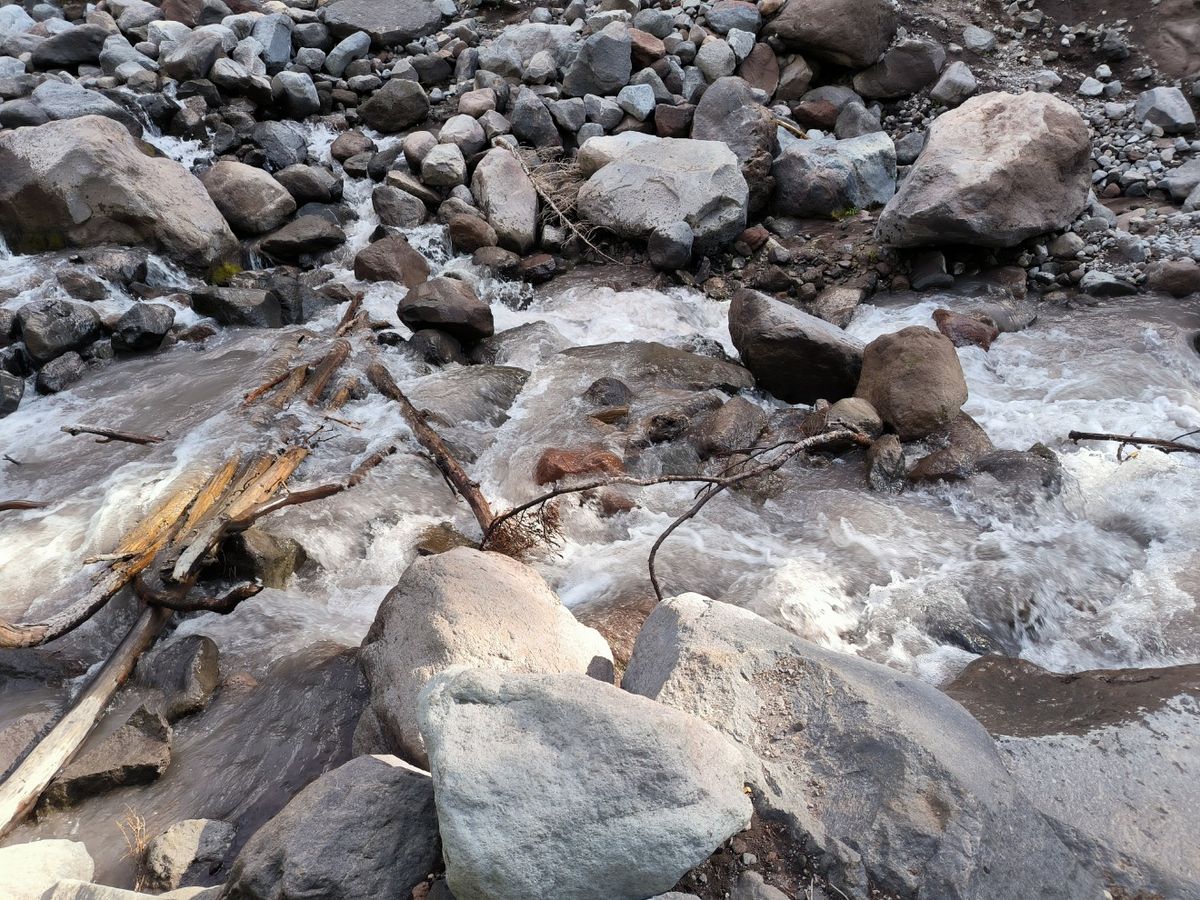 Gestern Abend im Zelt liegend konnten wir mehrmals das Hufgetrappel irgendwelcher Tiere hören. Absolut richtige Entscheidung, die Überquerung des Sandy River im ausgeruhten Zustand zu machen. Die Strömung ist heute viel schwächer, und der Wasserstand mindestens einen halben Meter weniger als noch vor 12 Stunden. Logisch eigentlich, denn der Gletscher schmilzt ja am Tage bei Sonne und nicht während der Nacht. Tap – Tap – Tap. Ruckzuck sind wir über vier Steine und zwei Baumstämme über die gesamte Breite des Flusses. Am anderen Ufer finden wir die Wegspur bald wieder, und los geht’s. Der Berg ruft. Wir steigen und steigen.