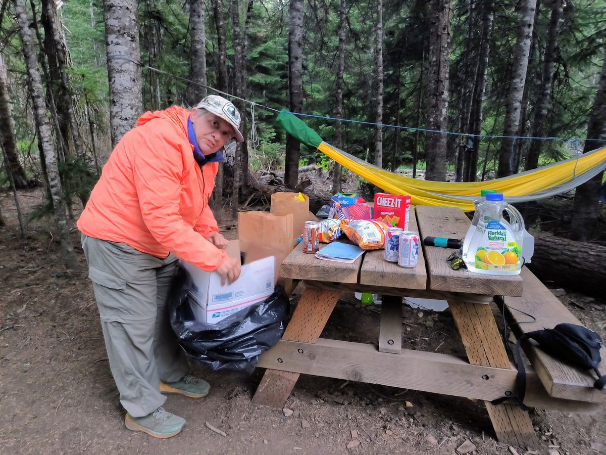 Am Highway 26 sollen Campsites sein, dort möchten wir Feierabend machen. Wir trauen unseren Augen nicht, als wir uns der Straße nähern : Zwischen den Bäumen steht ein Tisch, Bänke, Kühlboxen und allerlei Kartons. Eine Frau wartet auf „Gäste“, obwohl es mittlerweile schon 20.30 Uhr ist. Unsere erste Trail Magic auf dem PCT von „MacGyver“. Sie ist 63 und selber bereits den PCT gelaufen. Seit 3 Tagen schläft sie in einer Hängematte und bewirtet tagsüber die Hiker. Was für eine Überraschung ! Eigentlich möchten wir nur gerne Wasser haben für den Kaffee morgen früh. Eine Dose Bier und Chips gibt es als Zugabe, außerdem spannende Trail-Geschichten. Mit 1,5 Litern Wasser ziehen wir zufrieden ab, nur einmal um die Ecke zum Zelten.