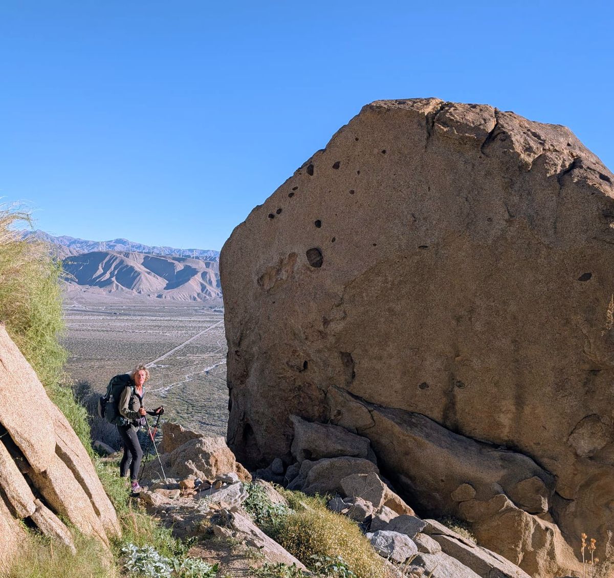 Bereits morgens um 8.00 Uhr knallt die Sonne gnadenlos. Kein Baum, kein Schatten. Eine blonde Frau kommt uns auf dem Trail entgegen. Das ist Michelle, die gestern in Warner Springs angehalten hat und uns fahren wollte. Sie kennt auch Paul, weil sie ihn vorgestern beim Trampen mitgenommen hat. Heute macht Michelle einen Tagesausflug in die Berge. Sie stellt viele interessierte Fragen. Wie das so geht auf einem Long-Trail, was wir essen, wie viel Wasser braucht man, welche Ausrüstung wir haben usw. ???