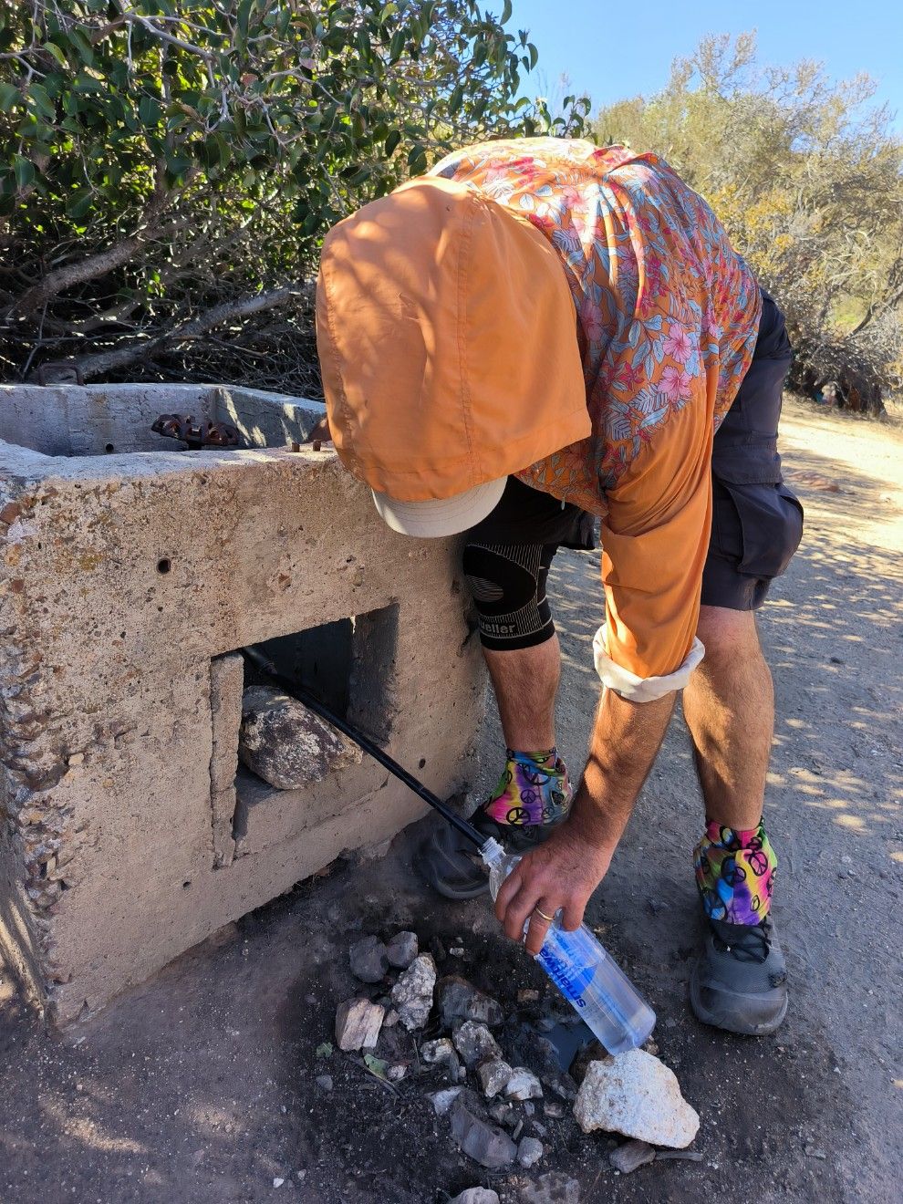 Nach ca. 3 Stunden kommen wir an eine Zisterne aus Beton. Immer noch kein Schatten. Trotzdem müssen wir den Rucksack wenigstens kurz absetzen. Wir hocken uns während der Pause zwischen niedrige Sträucher. Das nächste Wasser gibt es schon in erfreulichen 10 Kilometern. Sehr gut, es reicht also ein halber Liter pro Nase zum Mitnehmen. Wieder eine Zisterne mit altem Regenwasser, welches aus einem Rohr fließt. Dieses schmeckt nicht besonders gut, etwas abgestanden und moderig. Aber wir sind ja nicht verwöhnt. 😉