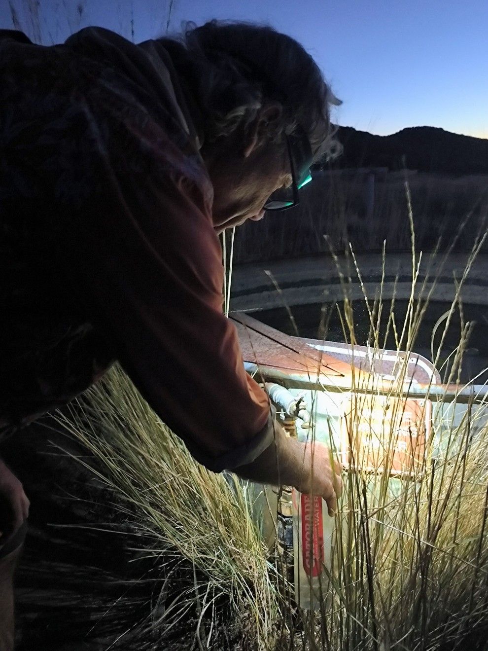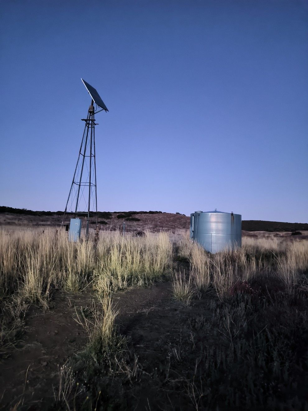 Den ganzen Tag lang steigen wir bergauf, insgesamt wieder über 1300 Höhenmeter. Nur Geröll und Stachelzeug. Der PCT wird wohl nicht mehr mein Freund.Beim Sunrise Trailhead laufen wir über den Parkplatz und biegen ab auf einen schmalen Seitenweg. Das ist der La Cima Trail. Es sieht nicht so aus, als ob hier viele PCT Hiker vorbeikommen. Da steht ein riesiger Tank mit einer Windmühle auf stoppeligem Feld. Ein Stück weiter gibt es ein Becken mit Wasserkran. Man muss am großen Bottich ein Ventil öffnen, damit es am kleinen Becken fließt. Aha – da wäre ich nie drauf gekommen. 😉 Es ist schon wieder sehr früh dunkel. Wir suchen uns einen Platz auf der trockenen Wiese und bleiben. Gestern hatten wir einige Kilometer mehr, heute kann ein früher Feierabend und eine längere Nachtruhe nicht schaden.