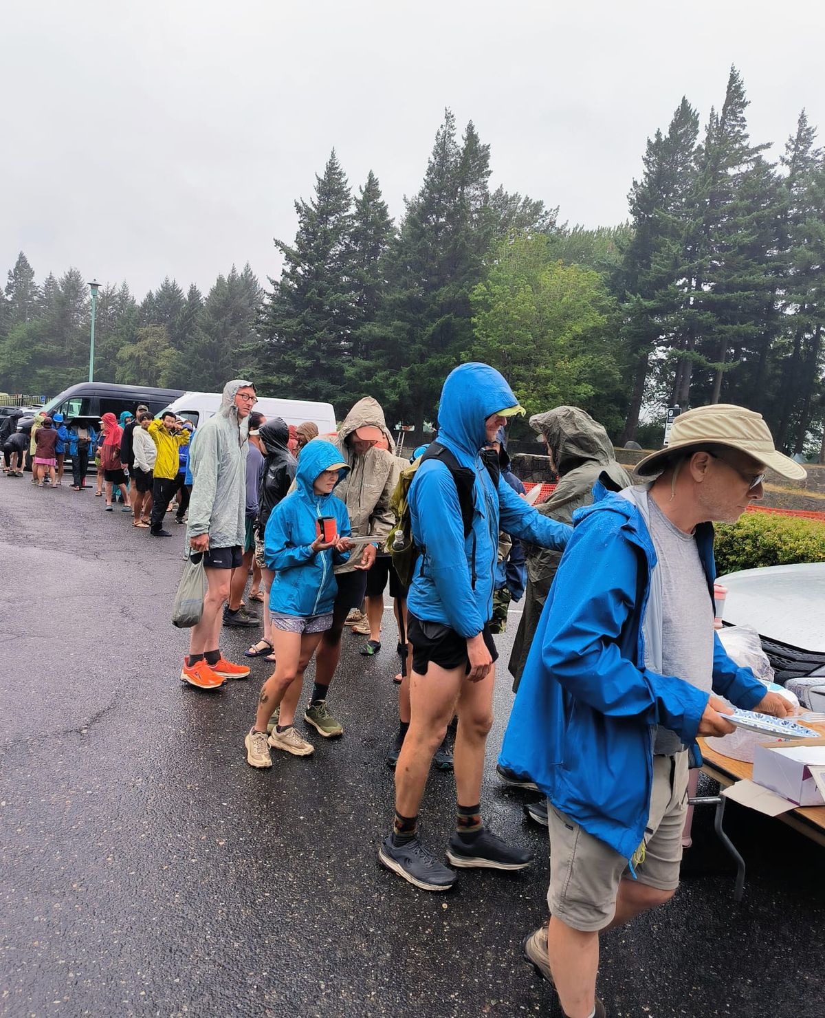 Das kostenlose Frühstück für alle Hiker ist ein Erlebnis für sich. Rührei, Toast, Pfannkuchen, Kaffee. Wir sind dabei, obwohl die Schlange ziemlich lang ist.