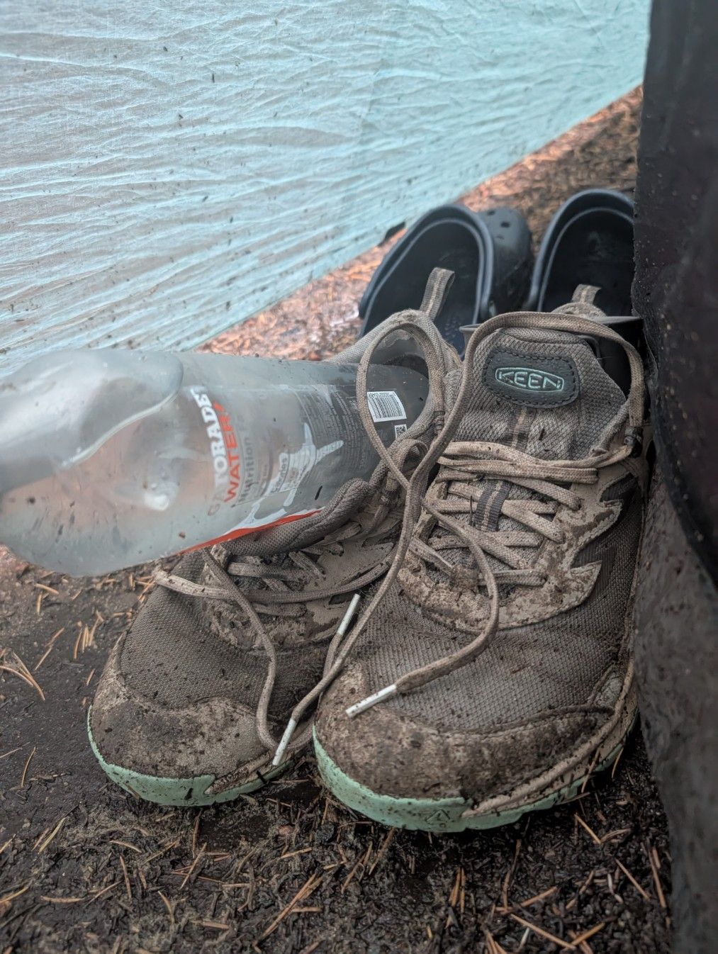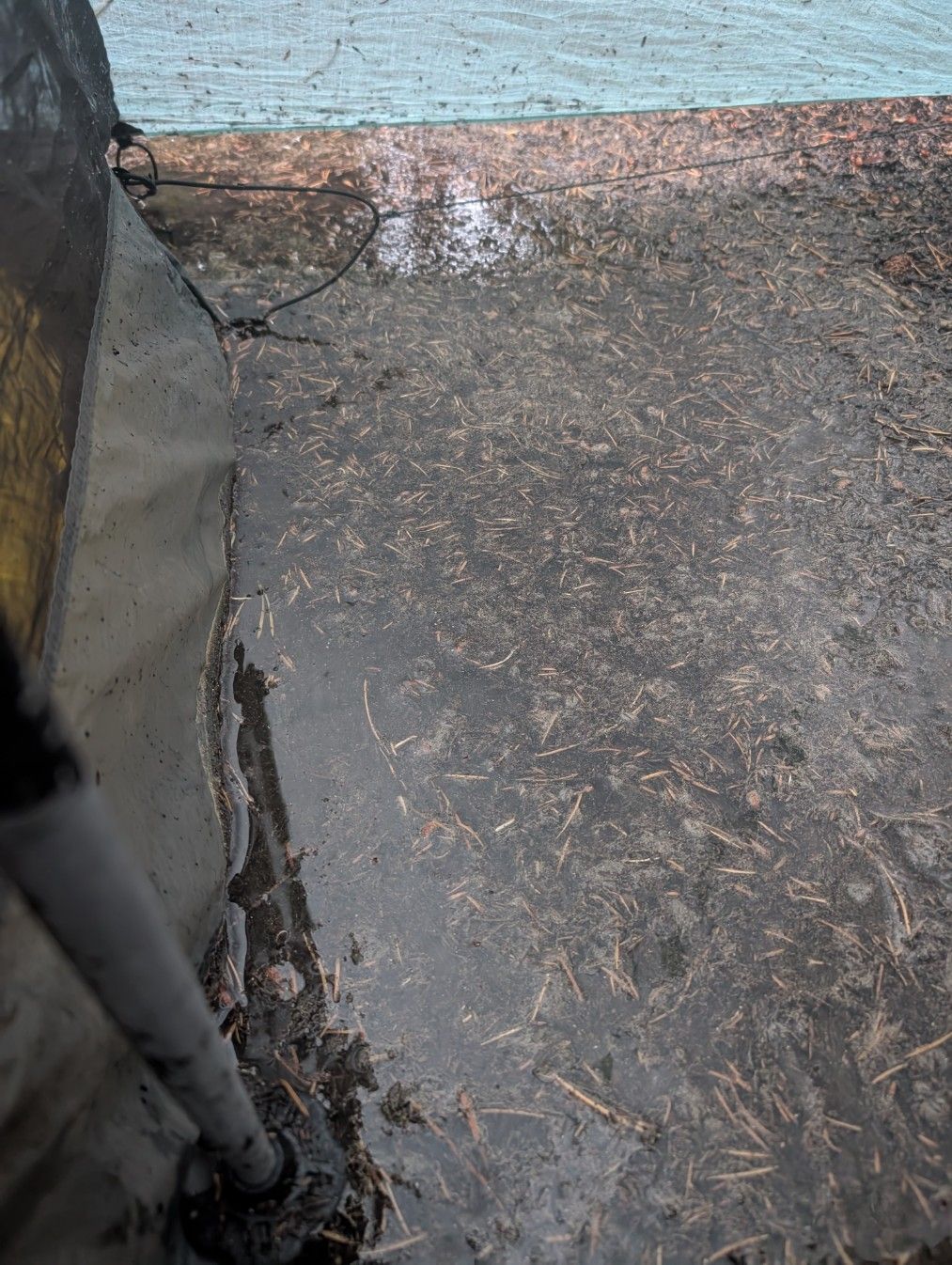 Irgendwann schwimmen meine Schuhe auf, die neben dem Eingang stehen, weil die Pfütze inzwischen so hoch ist. Es fehlt nur noch ein knapper Zentimeter, dann läuft es herein, und es regnet immer weiter. Wir sind leicht beunruhigt, weil wir nicht wissen, ob die matschige Pfütze zu uns ins Zelt schwappt. Der Boden unter den Isomatten fühlt sich kalt und feucht an, aber noch leckt nichts hinein. Ändern können wir die Situation im Moment nicht. Also was soll’s ……