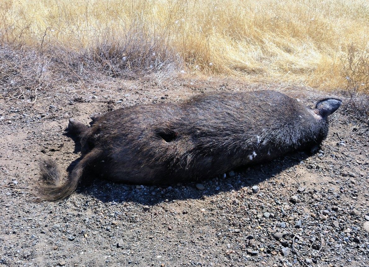 Auch die nächste Straße hat einen wohlklingenden Namen : „Wild-Mad-Road“. Sehr schön. Uns gefällt’s, und es ist der Weg zurück in die Zivilisation. Ein totes Wildschwein liegt an der Seite. Es sieht aus, als hätte es ein Einschussloch im Rücken. Wahrscheinlich ist es trotz der Verletzung seinem Jäger noch davongerannt.