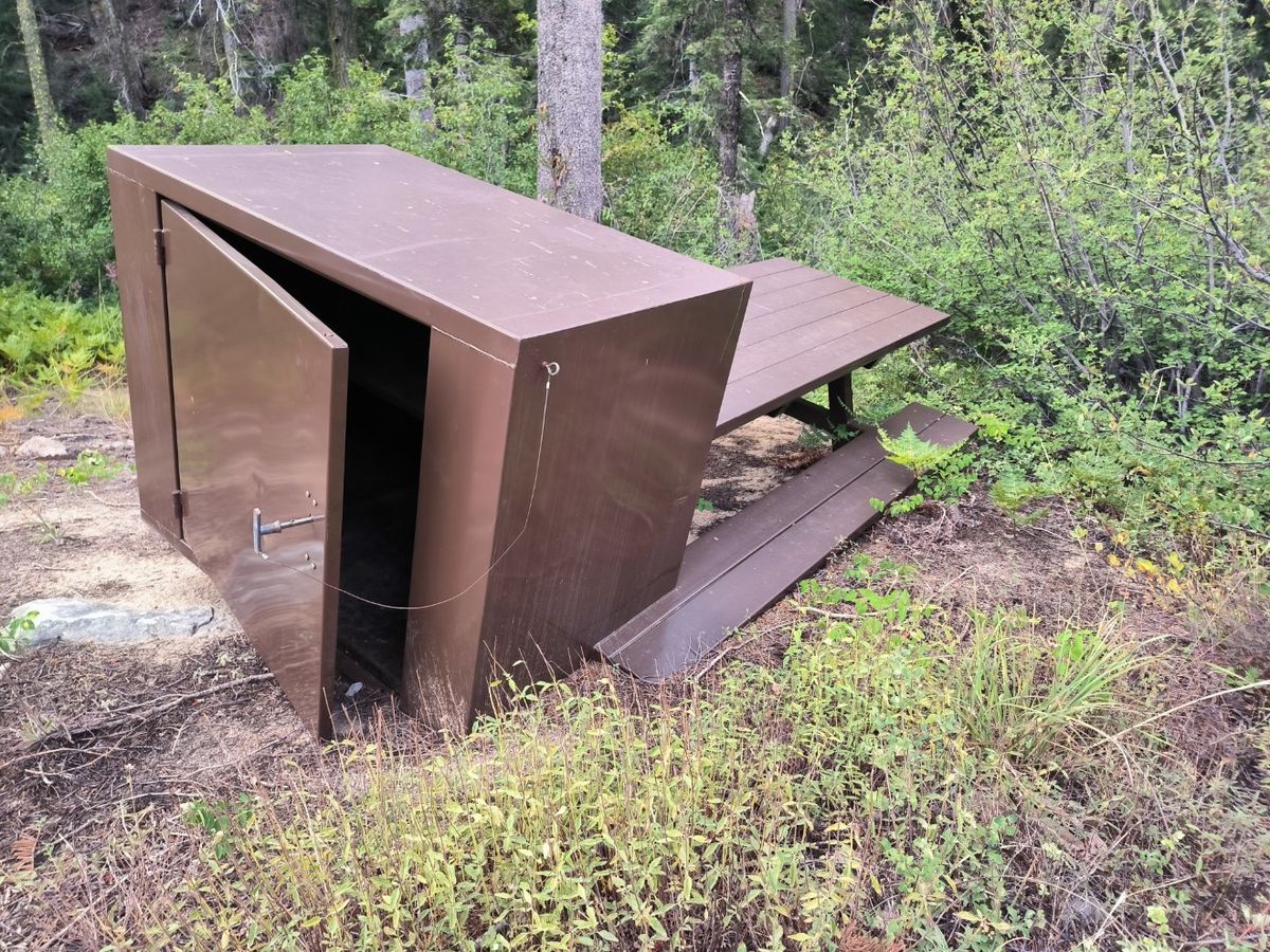 Theoretisch dürfen wir umsonst hinten auf der Wiese zelten, aber dieses Angebot werden wahrscheinlich mehrere Hiker nutzen. Wir fahren lieber noch ein Stück weiter und finden schon bald einen verlassenen Campingplatz. Die einzelnen Parzellen sind nummeriert. Bärensichere Metall-Boxen, die nicht mehr schließen, stehen neben kaputten Picknick-Tischen. Es gibt sogar ein Toiletten-Haus, aber das gucken wir uns lieber gar nicht an. Alles verwahrlost, Gras und Unkraut stehen hoch. Für uns ist dieser Platz ideal zum Übernachten. Kostenlos, nicht illegal, und wir sind alleine.