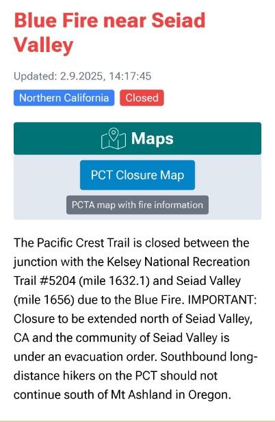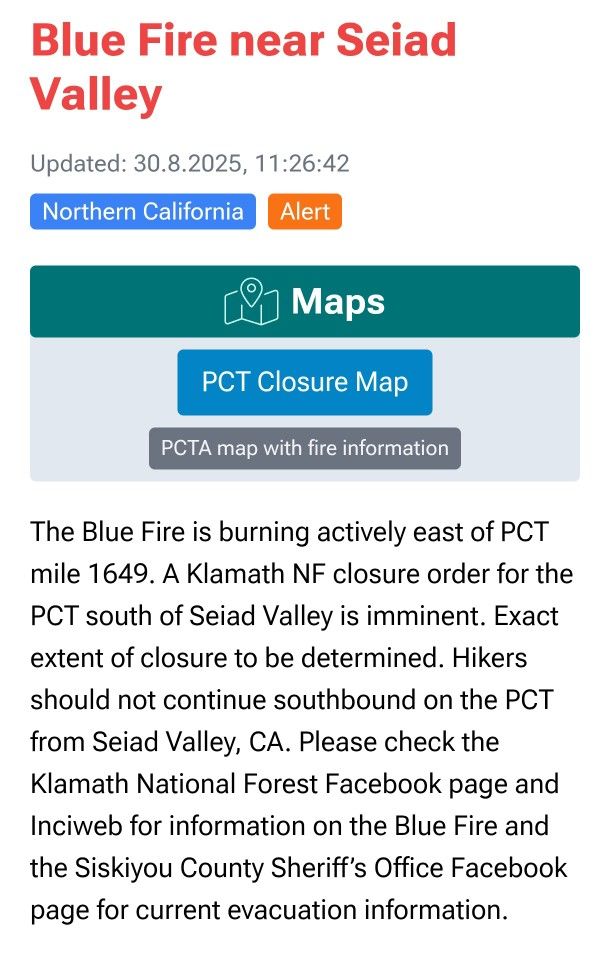 Es brennt um Seiad Valley. Der Trail ist offiziell geschlossen. Houdini und Shortcut wollten eigentlich bei Callahan’s Lodge wieder auf den PCT, aber nun werden sie die Grenze von Oregon nach Nord-Kalifornien leider auch nicht zu Fuß überschreiten. Sie müssen ungefähr 100 Kilometer überspringen und woanders wieder einsteigen. Dasselbe Problem hätten wir auch gehabt, wenn wir uns nicht zufällig bereits 3 Tage vorher für Plan B entschieden hätten.