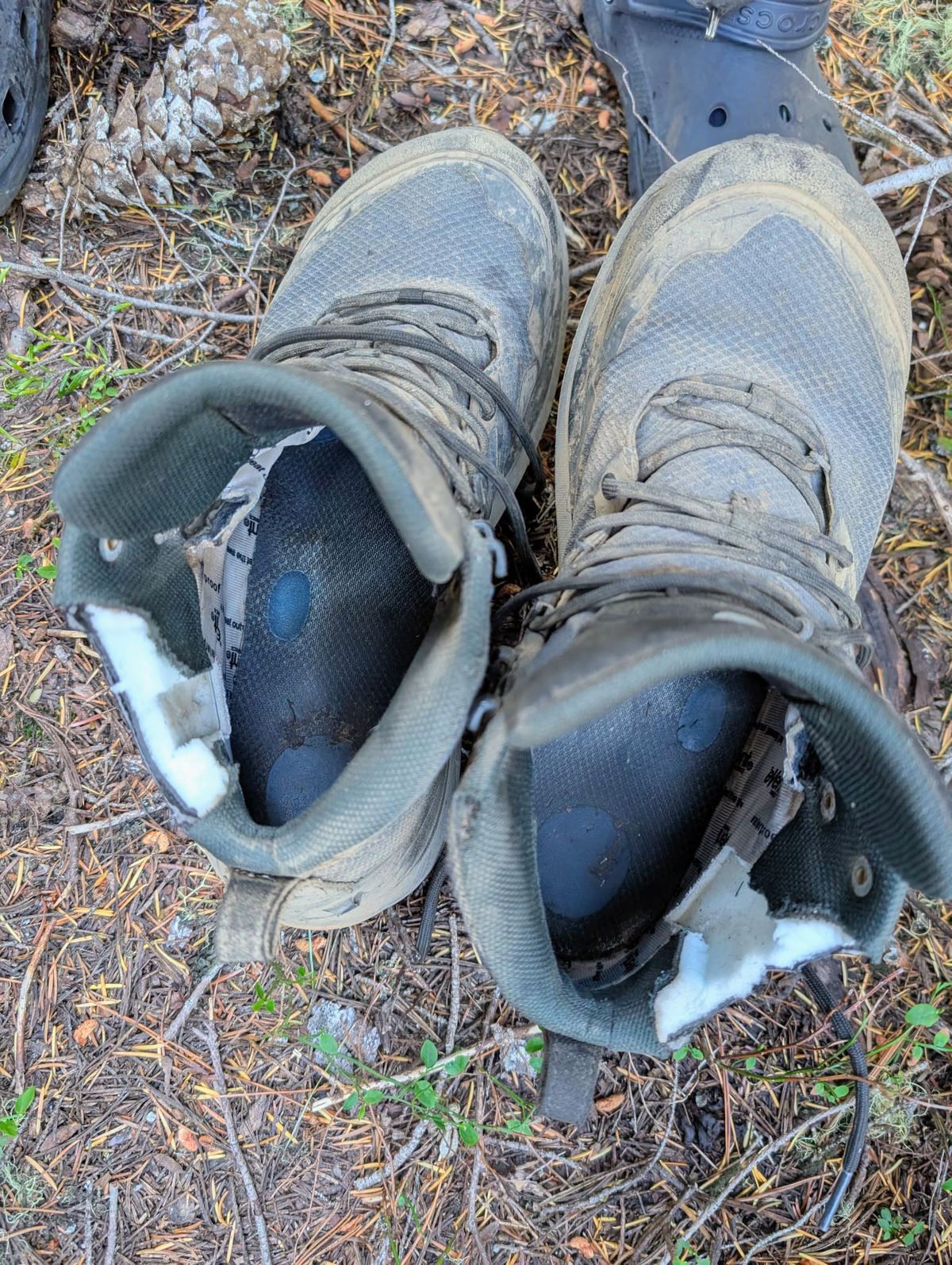 Alles gut bei mir. Aber Thomas schneidet ein weiteres Stück von seinen Schuhen ab. Am 5. Tag sind wir wieder richtig im Trott und können ganz normal weiterlaufen. Es riecht stark nach Rauch, und das schon seit gestern Abend. Anscheinend brennt es irgendwo hinter uns. Das Feuer kann weit weg sein, aber der Nordwind treibt den Qualm in unsere Richtung. Dicke Luft. In den Tälern hängt gelber Dunst. Feuer auf dem Trail ist die häufigste Ursache dafür, dass man eine Sektion auslassen und später nachholen muss.