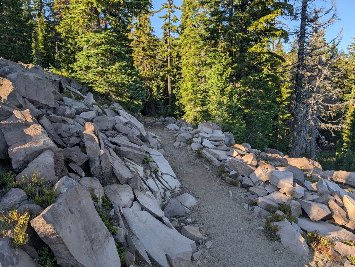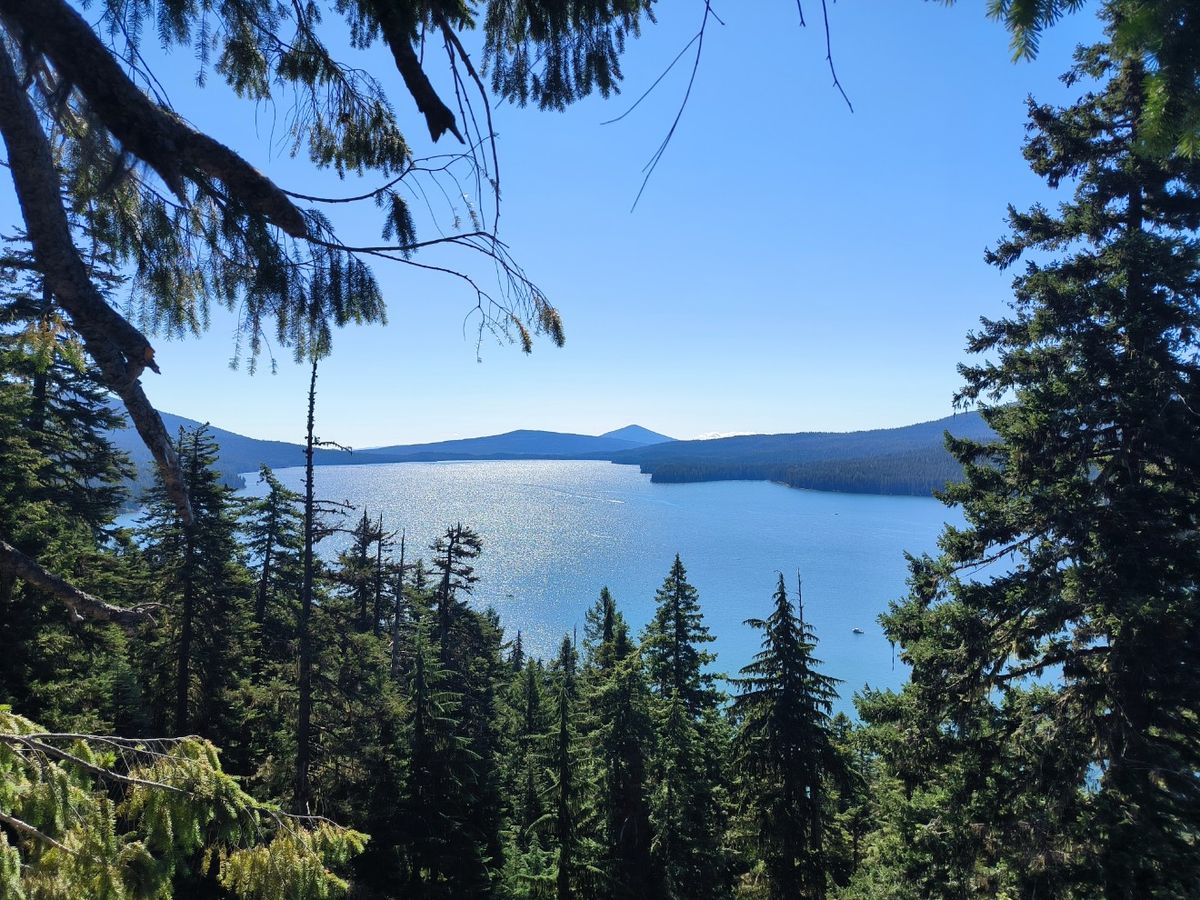 Von einem Felsvorsprung aus haben wir eine tolle Aussicht auf den Odell Lake. Groß und richtig schön ist dieser See, also ein Foto wert. Ein paar Wassersportler, einige Stege am gegenüberliegenden Ufer. Dort liegt das Shelter Cove Resort, wo viele Hiker ein paar Stunden mit Essen, Trinken und Internet verbringen. Wir haben diesen Stopp für uns ausgeklammert, weil wir in der letzten Woche genug gefaulenzt haben. Die erste Pause machen wir am Midnight Lake. Es gibt Haferflocken. Wir sind hungrig, weil wir gestern Abend nicht mehr gekocht haben. Keine Moskitos, aber dafür krabbeln Riesen-Waldameisen auf uns herum.