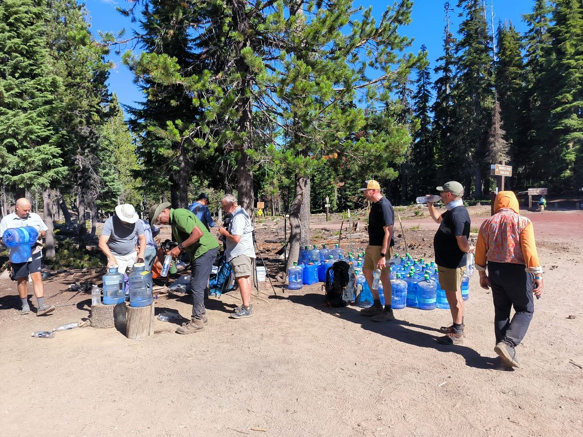 Mittags überschreiten wir den höchsten Punkt Oregons auf dem PCT. Laut Schild 7560′ Fuß hoch, das sind über 2300 Meter. Unser nächstes Wasser bekommen wir am Thielsen Creek. Es ist eiskalt und lecker, Gletscherwasser vom Mount Thielsen. Hier lernen wir „Tigger“ kennen, der ebenfalls SoBo von Kanada nach Mexiko läuft. Er hat bereits den AT und den CDT geschafft, nächstes Jahr gibt es wahrscheinlich ein Wiedersehen bei der Verleihung der Triple Crown. Wir gönnen uns eine lange Pause, Zeit zum Waschen und für eine warme Mahlzeit. Um 14.00 Uhr haben wir bereits 25 Kilometer geschafft. Frühes Aufstehen lohnt sich immer, auch wenn es schwer fällt. Vom Thielsen Creek aus liegt wieder eine ewig lange trockene Strecke vor uns. Laut den Kommentaren in unserer App könnten wir an einer Schotterstraße in 12 Kilometer Entfernung mit Trail Magic Wasser rechnen. Das wäre super, dann müssen wir nicht volle Ladung tragen. Unterwegs treffen wir Juri, den schüchternen Russen-Jungen. Er macht gerade Pause am Rande des Trails und freut sich offensichtlich, uns zu sehen. Wir haben in den letzten Tagen noch manchmal an Juri gedacht, denn wir finden diesen bescheidenen Jungen sympathisch. Ein bisschen tut er uns auch leid. Juri kündigt uns volles Programm Trail Magic an : Hamburger, Wassermelone, Eis und Dusche. Wir können es kaum glauben. Umso schneller rennen wir dir letzte Stunde bis zur Straße hinunter. Bingo !