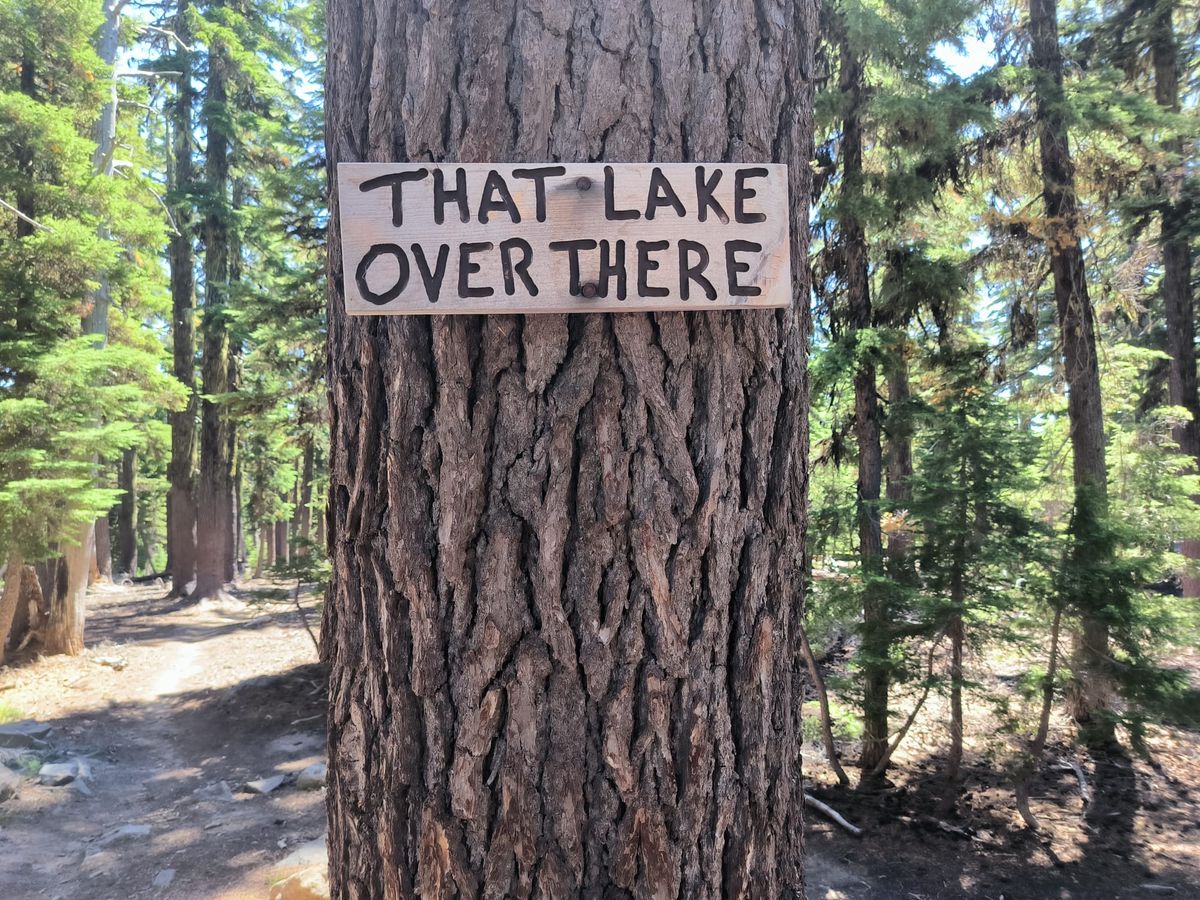 Genug gejammert. Am besten ignorieren wir die ganzen Wehwehchen und machen einfach weiter. Der Summit Lake ist groß, in der Mitte liegt ein kleines Inselchen. Es weht kräftig, da steht richtig Fetsch auf dem See. In Ufernähe ist es sehr flach mit einem schmalen Streifen Sandstrand, an den die Wellen plätschern. Wasser nehmen, das klappt nicht mit trockenen Füßen. Der Boden unserer Trinkflaschen ist bedeckt mit Sedimenten. Filter-Killer nennt man das. Anschließend beginnt eine trockene Strecke von 14 Kilometern. Wir müssen wohl oder übel jeder einen Liter tragen für die Pause. Es geht hoch hinauf. Ein Steinmännchen auf der linken zeigt den Abzweiger zum Cowhorn Mountain an. Wir sind froh, dass wir diesen Gipfel nicht besteigen müssen. Der PCT führt gnädig drum herum. Immerhin befinden wir uns schon wieder auf einer Höhe von 2500 Metern. Es geht in der prallen Mittagshitze immer über die Ridgeline. Kurzer Stopp mit Blick auf die Seen, die wir in den vergangenen zwei Tagen passiert haben. Hier oben genießen wir das Laufen auf einem schönen Pfad zwischen Tannenbäumchen und Geröll. Über einen Seitenweg abwärts geht es zu unserem nächsten See, der ordentlich an Durchmesser und Tiefe verloren hat. Bald ist er gar nicht mehr vorhanden, die Sonne trocknet wahrscheinlich alles in Kürze weg. Das Wasser ist so seicht, dass Thomas barfuß bis in die Mitte muss, um unsere Flaschen zu füllen. Alternativlos. Danach liegen noch einmal 14 trockene Kilometer vor uns bis zur Six Horse Spring.