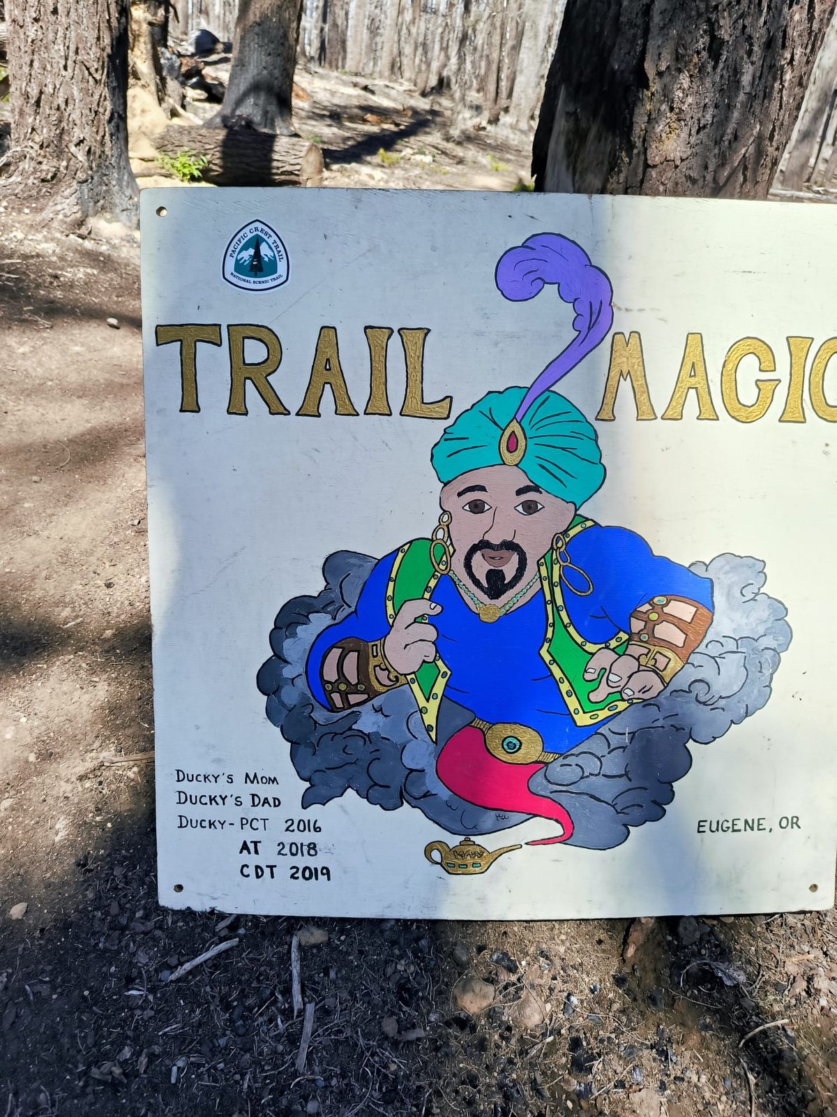 Auf unserer Seite des Trails sind Dutzende von Kanistern mit Wasser aufgebaut. Darauf hatten wir gehofft ( und spekuliert ). Alle unsere Flaschen sind wieder voll. Ein Schild verkündet noch mehr Trail Magic auf der anderen Straßenseite. Gegenüber gibt es ein riesiges Angebot. Diese großzügige Trail Magic wird von den Eltern eines NoBo Hikers ausgerichtet. Da steht tatsächlich eine transportable Dusche, Handtuch, Seife, Creme inklusive. Außerdem eine Eismaschine, frisches Obst, Kekse, Chips, Hot Dogs und Batterien zum Laden der Elektrogeräte. Hamburger und kalte Getränke sind leider nicht mehr da. Mutter Barbara kann sich gut an den hungrigen Russen erinnern. Der hat wohl gleich mehrere Hamburger verputzt. Auch dem Vater war die armselige Kleidung des Jungen aufgefallen. Schuhe drei Nummern zu groß, Ausrüstung aus der Hiker-Box zusammen gesucht. Auf jeden Fall haben sie Juri ordentlich vollgestopft und ihm noch reichlich Proviant für die nächsten Tage mit auf den Weg gegeben. Das freut uns sehr. Da verzichten wir doch gerne auf einen Hamburger. Ein Schweizer soll auch hier gewesen und eine Stunde vor unserer Ankunft gegangen sein. Houdini hat sich ins Register eingetragen. Den werden wir dann morgen vielleicht beim Crater Lake treffen. 🙂