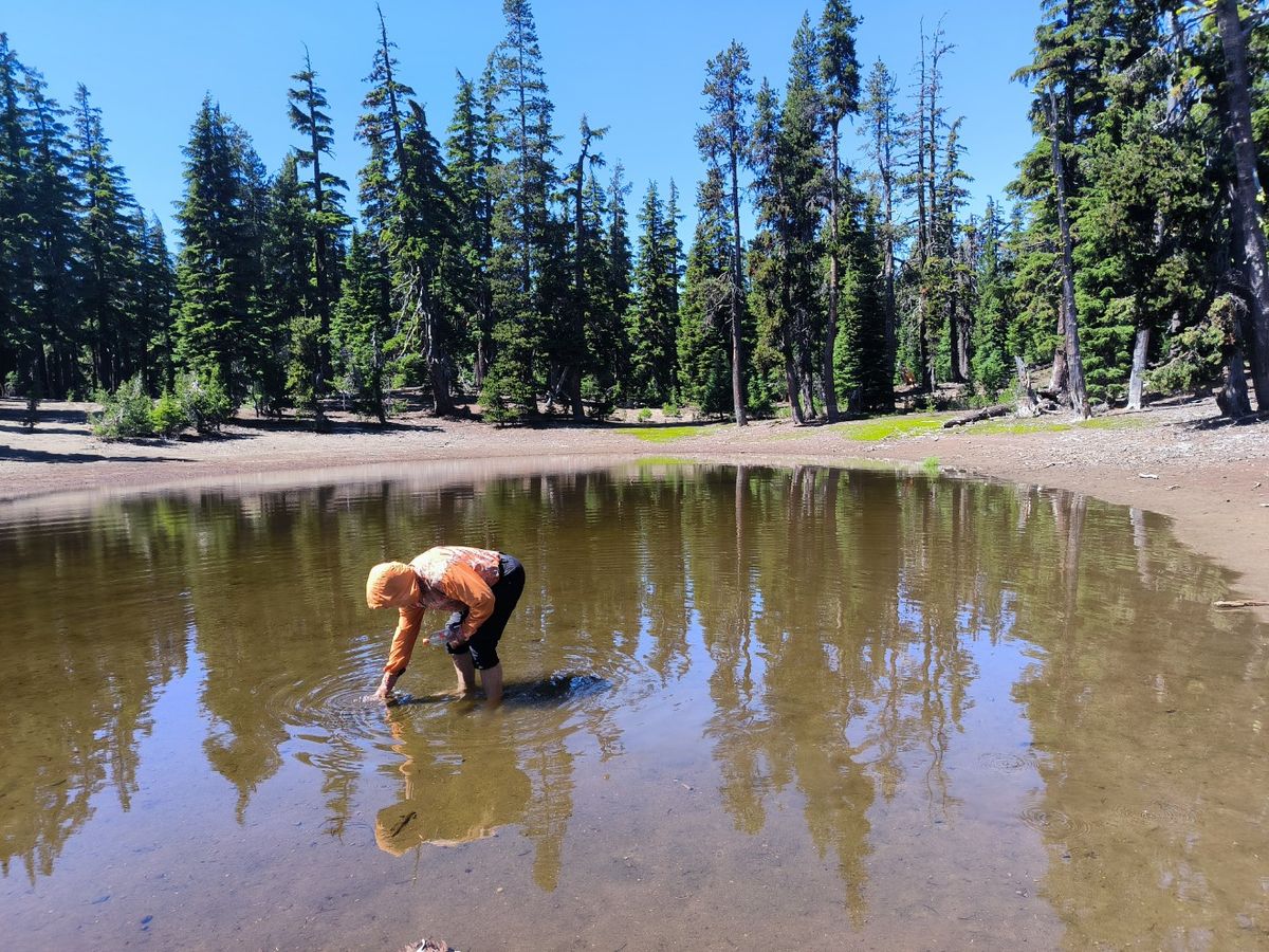 Eigentlich hatten wir einen kleinen Bach für unser Trinkwasser angepeilt, aber da gibt’s nichts mehr, der ist komplett ausgetrocknet. Unser nächstes Wasser holen wir an einem See, wo es Lurche zu beobachten gibt. Schlanke Oregon-Salamander mit einer Körperlänge von etwa 10 Zentimetern, vier Beinen und einem runden Kopf.