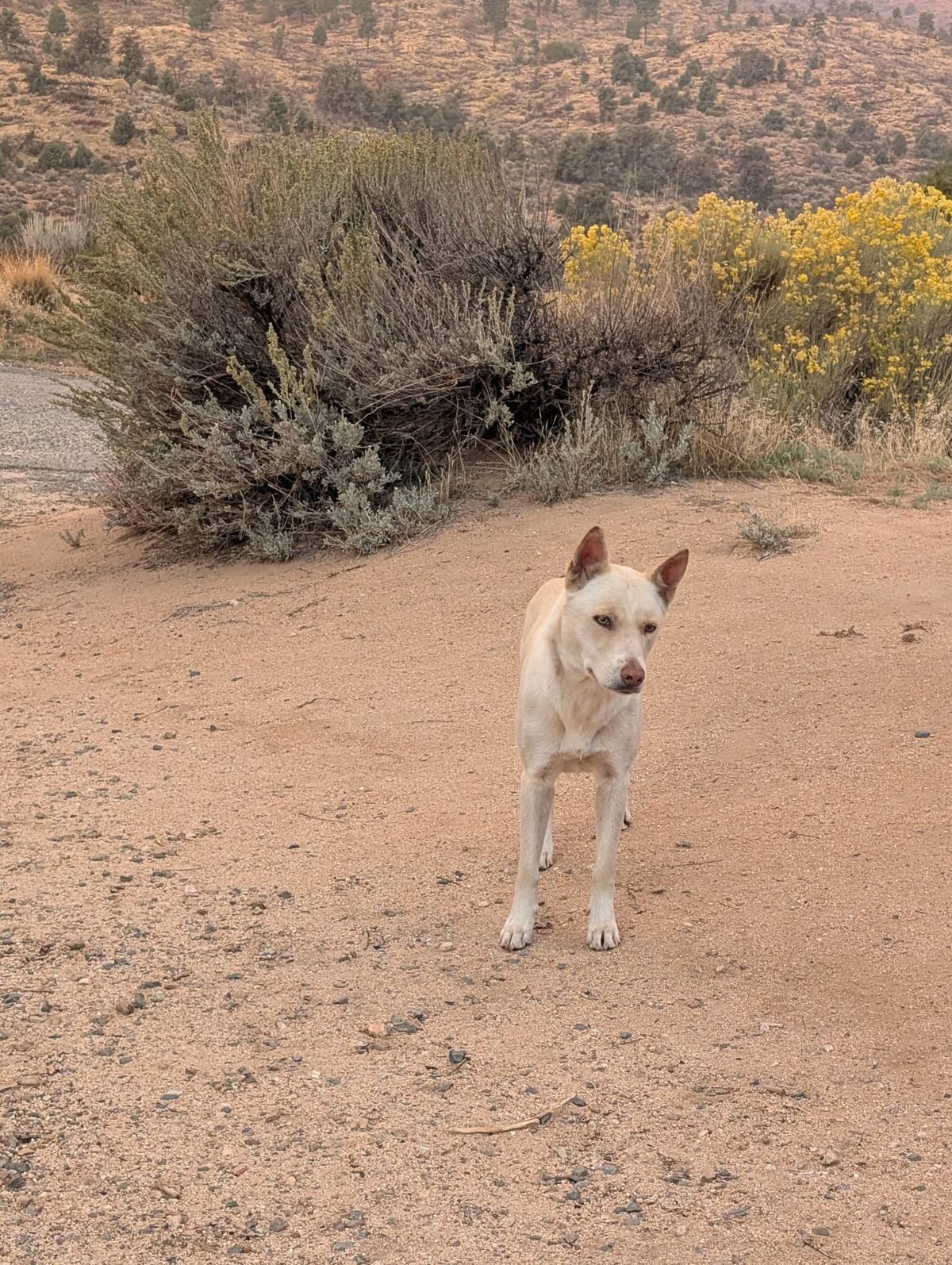 Während der Nacht war von allen Seiten Kojoten-Geheule zu hören. Das müssen mehrere Rudel gewesen sein, und sie waren ziemlich in der Nähe. Morgens früh steht schon der weiße Hund bereit und schaut erwartungsvoll zu uns herüber. Gestern im Walmart haben wir das obligatorische Hähnchen gekauft und nicht ganz aufgegessen. Heute bekommt Mia die Reste vom gebratenen Hähnchen zum Frühstück. Wenig später steigt unsere Nachbarin aus ihrem Camper und serviert die zweite Portion Futter. Der Hund ist schon ganz zutraulich geworden, obwohl er immer noch den Schwanz ängstlich zwischen die Hinterbeine geklemmt hat. Mia muss schlimme Erlebnisse hinter sich haben. 🙁