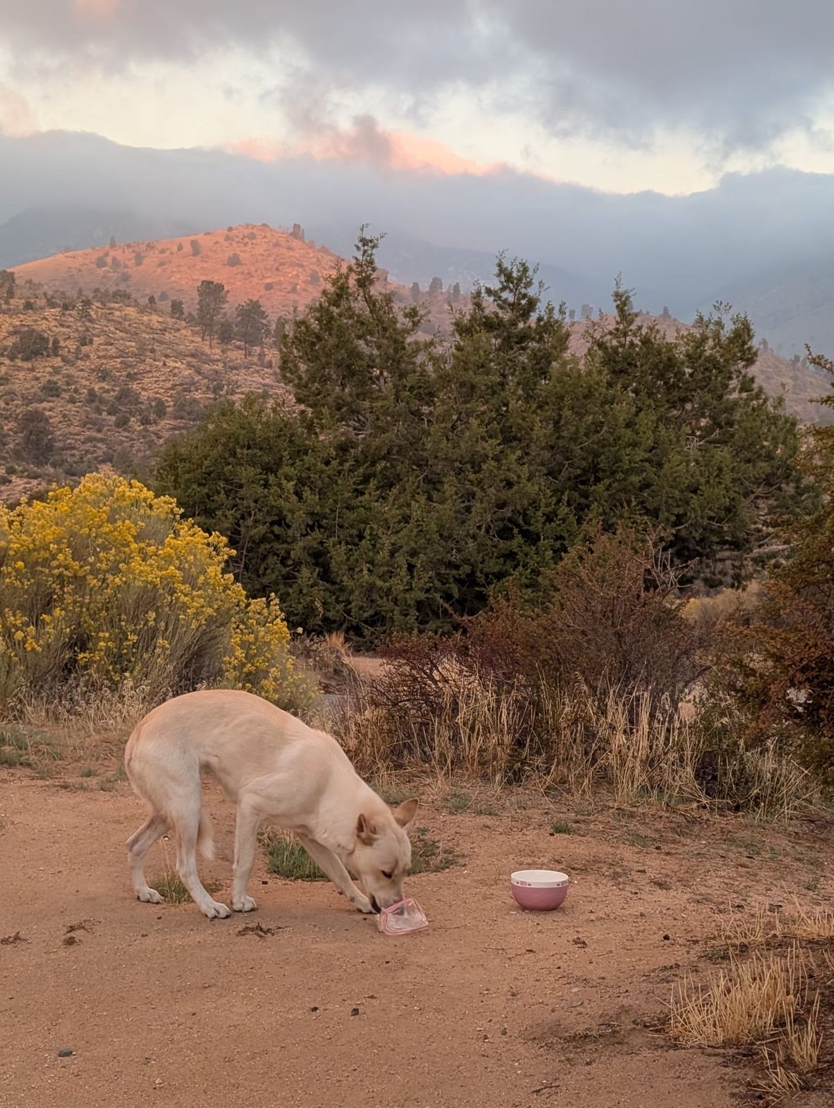 Stadtrundfahrt kreuz und quer durch Ridgecrest, bevor der Bus endlich auf den richtigen Highway abbiegt. Die Fahrt dauert 3 mal so lange wie auf dem Hinweg. Um Viertel nach 7 abends erreichen wir den Walker Pass Campground und beziehen eine Parzelle mit Picknicktisch. Ein weißer Mischlingshund beobachtet uns. Von diesem Streuner haben wir bereits in den Kommentaren unserer App gelesen. Er soll scheu und sehr hungrig sein. Neben unserem Zeltplatz „wohnt“ eine Frau in ihrem Wagen. Sie kommt heraus und quatscht uns voll. Sehr gesprächig ist sie. Den Hund hat sie „Mia“ getauft. Er wird von ihr seit ein paar Tagen gefüttert, und sie hofft, dass sie Mia morgen „adoptieren“ kann. Wir stören das weiße Hündchen bestimmt nicht, eher stört uns die geschwätzige Dame. 😉 Wasser müssen wir auch noch besorgen. Das gibt’s nicht einfach so hier auf dem Campingplatz. Dafür müssen wir noch einmal zurück, ein Stück neben dem Highway laufen und im Dunkeln den Weg zur Quelle suchen. Es dauert eine halbe Stunde, bis wir mit 7 Litern Wasser zurück beim Zelt sind. Nicht optimal, aber so sind wir wenigstens früh morgens wieder auf dem Trail und können direkt los.