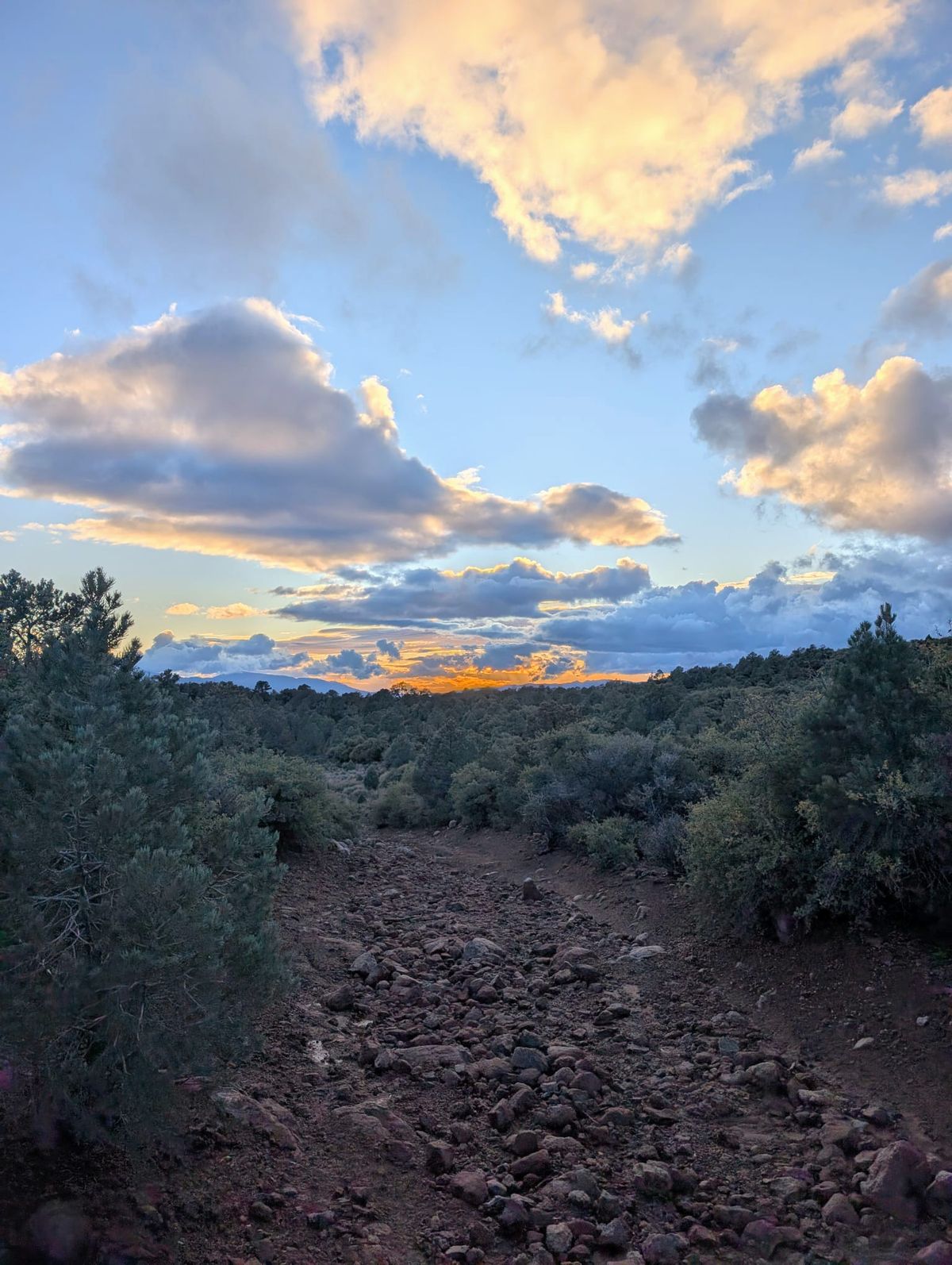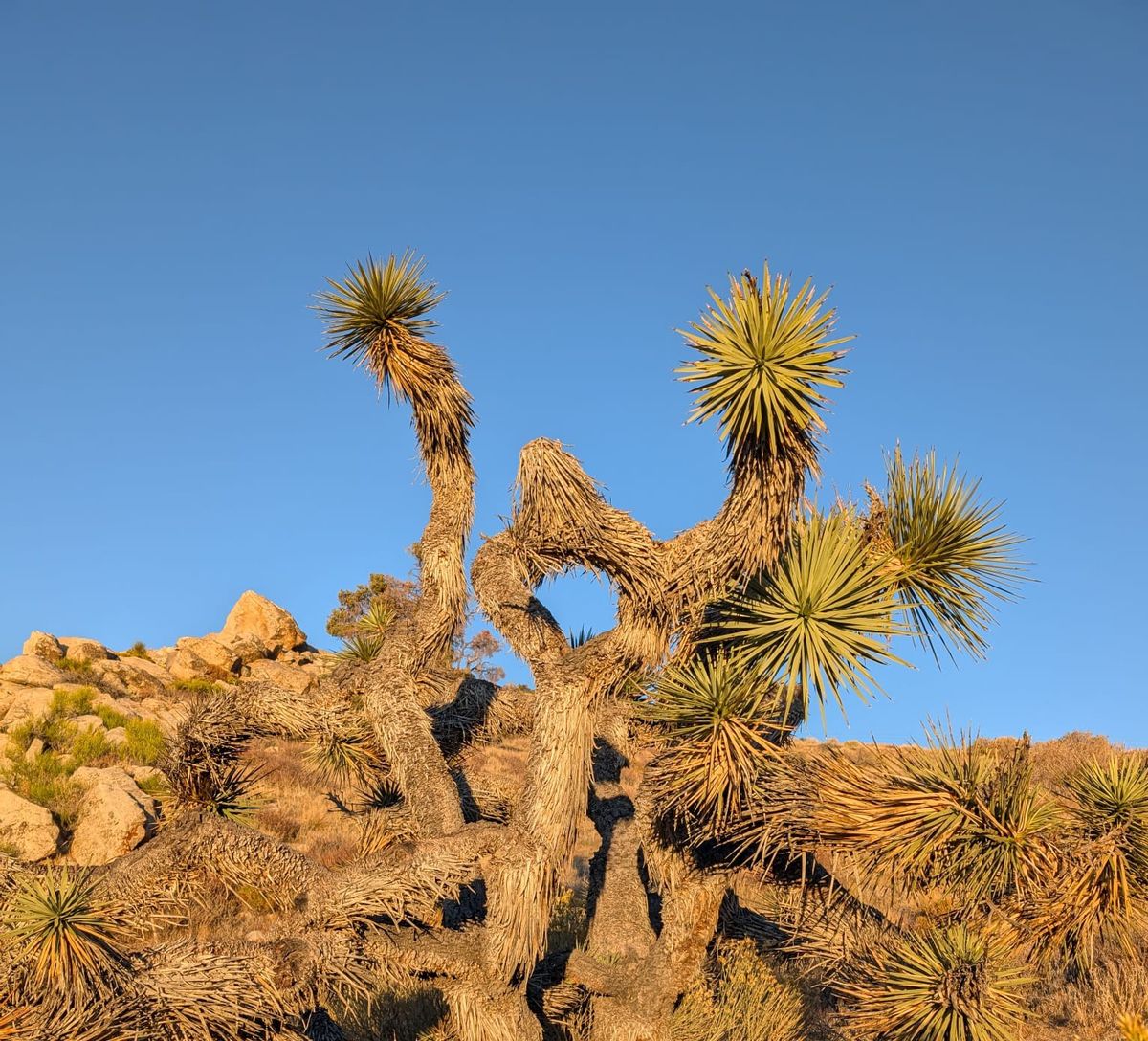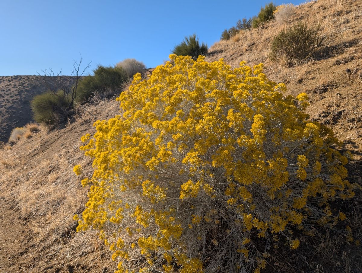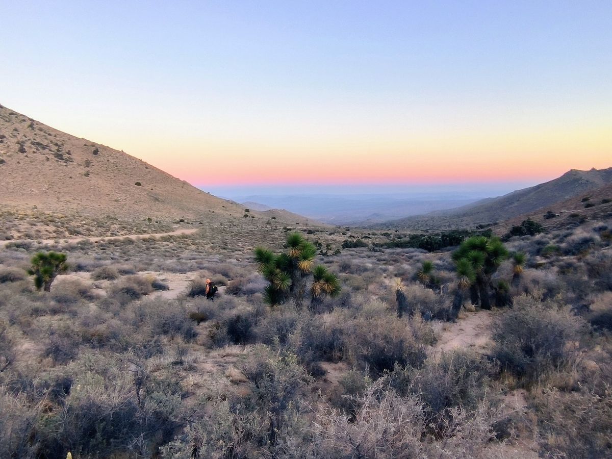 Weiter oben wachsen Kalifornische Kiefern, die haben wir schon länger nicht mehr gesehen. Helle Boulder in allen Größen und Formen liegen durcheinander im Sand. Sehr zu unserem Erstaunen klettern wir durch Fels-Formationen wie in den Sierras. Es wirkt wie eine unerwartete Laune der Natur, das passt so gar nicht in das Bild der letzten Tage. Wir laufen durch die Saint Johns Ridge. Die Temperatur ist merklich kühler geworden. Immerhin sind wir drei Stunden lang aufgestiegen. Ich merke es in den Beinen. Später stellen wir fest, dass wir uns auf über 3200 Meter Höhe befinden. Unser Witz des Tages : „Die Wüste ist flach.“ 😉