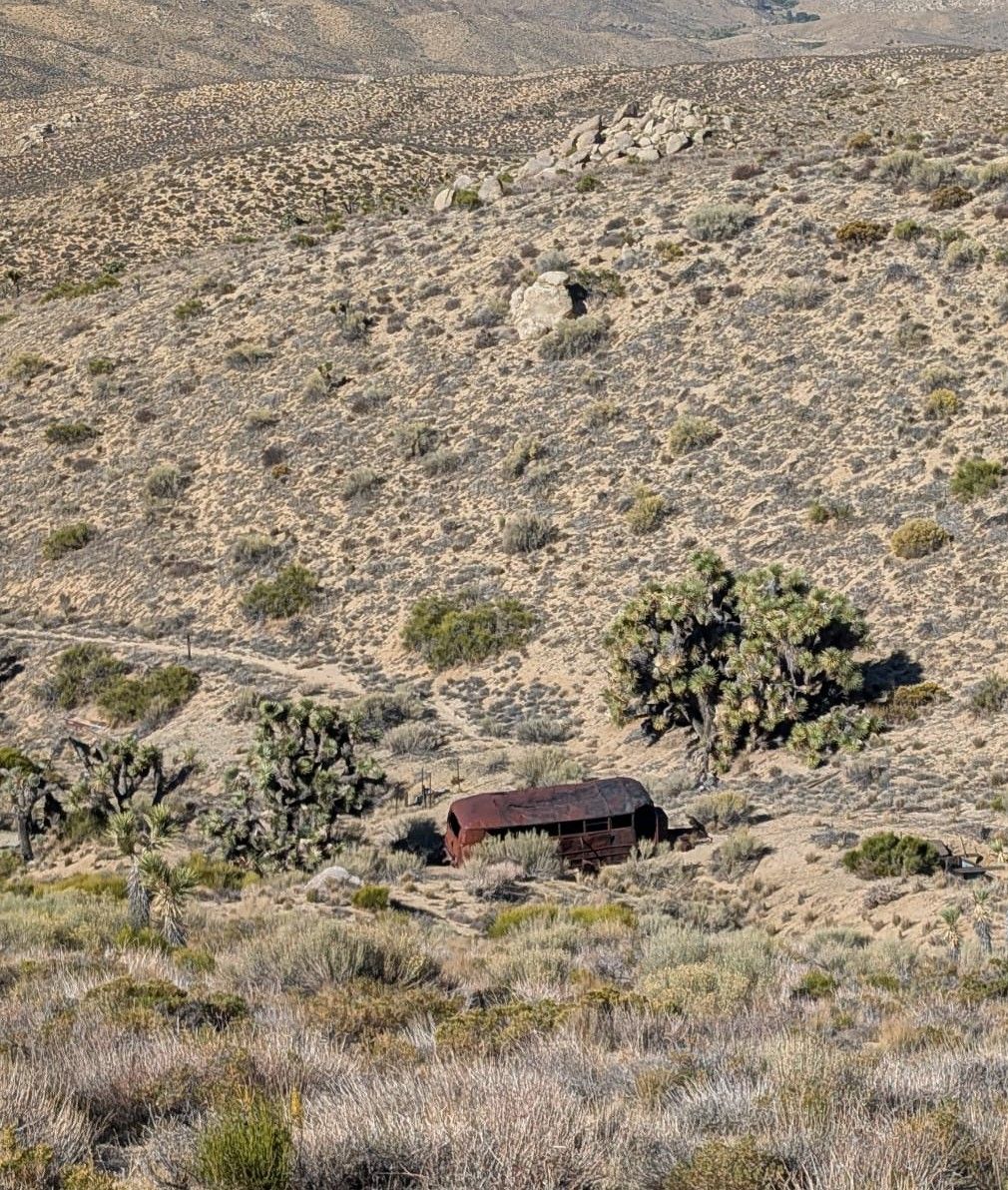 Früher Tagesbeginn – wie immer klingelt der Wecker um 5.30 Uhr. Die Nacht war den Umständen entsprechend gut. Das Wetter hat sich beruhigt, der Morgen sieht friedlich aus. Bei Sonnenaufgang sind wir bereits unterwegs. Wir gehen noch einmal zum Wasser-Depot und füllen unsere Flaschen. Nächstes water cache an der Kelso Road ist 25 Kilometer entfernt. Insgesamt liegen heute 36 Kilometer vor uns, 1400 Höhenmeter Aufstieg inklusive. Ein total verrosteter Bus liegt in den Dünen. Vorher haben wir schon einige andere rostige Relikte gesehen. Die stammen noch aus Zeiten, in denen es in dieser Gegend zahlreiche Minen zum Abbau von Silber gab.