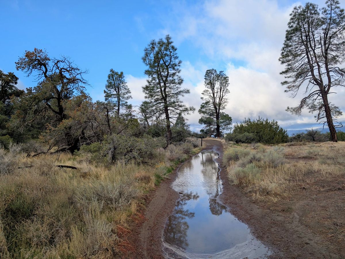 Mittlerweile ist es 15.00 Uhr, und es tröpfelt nur noch. Endlich haben wir die Wasserquelle erreicht. Die Golden Oaks Spring ist eine Enttäuschung. Das Wasser im Trog sieht gar nicht gut aus. Es fließt nicht, ist von hellbrauner Farbe und irgendwie schmierig. Aber man darf nicht wählerisch sein. Thomas muss 7 Liter Wasser durch den Filter pressen. Das dauert. Inzwischen ist uns so kalt geworden, dass wir heißen Kakao kochen. Dazu essen wir jeder eine Dose Ölsardinen und eine Banane, beides aus der Trail Magic von gestern. Und weiter geht’s. Der starke Regen hat tiefe Rinnen in den Weg gegraben. Manche Gräben sind einen halben Meter breit. Es regnet nicht mehr, aber das Laufen im Schlamm ist rutschig und zäh. Der Matsch klebt an den Schuhen wie Lehm. Die Füße werden immer schwerer.