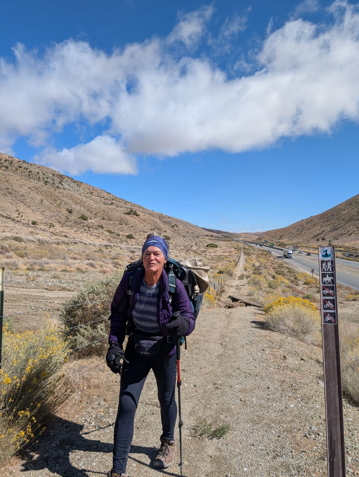 Es bleibt trocken, aber kühl. Wir werden den ganzen Tag von heftigem Wind gebeutelt, der an unseren Rucksäcken zerrt und den Sand ordentlich aufwirbelt. Dazu kommt, dass der PCT hier mehrere Kilometer auf einer Piste verläuft, die von off-road-Fahrzeugen stark befahren und ausgehöhlt ist. Ganz blöd zu laufen in dieser schrägen Rinne. Einmal rutsche ich aus und falle auf’s Knie. Die Hose bleibt heile, das Knie ist blutig. Schätzungsweise 99 % vom PCT sind für motorisierte Fahrzeuge gesperrt. Auf dieser Piste ist es erlaubt, und wir haben nun mal gerade das Pech, zur falschen Zeit hier zu sein. Es ist Wochenende, vielleicht ist deswegen so viel los. Zuerst kommen uns vier Enduros entgegen, dann zwei Jeeps. Etwas später wieder Motorenlärm, ein paar Geländemaschinen und zwei Quads mit hoher Geschwindigkeit. Motorgeräusche von hinten, ein paar Enduros haben anscheinend umgedreht und fahren zurück. Meine Güte – das ist jetzt aber nervig ! Nicht nur der Lärm und dass wir jedes Mal von der Piste in die Büsche ausweichen müssen, um denen Platz zu machen. Jedes Fahrzeug wirbelt enormen Staub auf, der sich erst ein paar Minuten später wieder setzt. 🙁 Ich kann schon gar nicht mehr freundlich grüßen. Dabei können diese Leute ja gar nichts dafür. Die wollen nur ihren Spaß haben, es ist eben eine andere Art von Freizeitbeschäftigung. Nach zwei Stunden zweigt eine schmale Spur in den Wald ab. Von jetzt an läuft der PCT parallel zur Sandpiste. Man hört zwar noch den Motorenlärm, aber es ist kein Ausweichen mehr nötig, und wir kriegen keinen Staub mehr von den Maschinchen ab. Der Wind wird immer stärker und kommt aus Süd-West, also meistens von vorne. Schwierig ist es, am offenen Hang ungeschützt zu laufen. In den Böen muss man sich regelrecht dagegen stemmen, damit man nicht aus der Kurve gehauen wird. Die Stöcker leisten dabei gute Dienste.