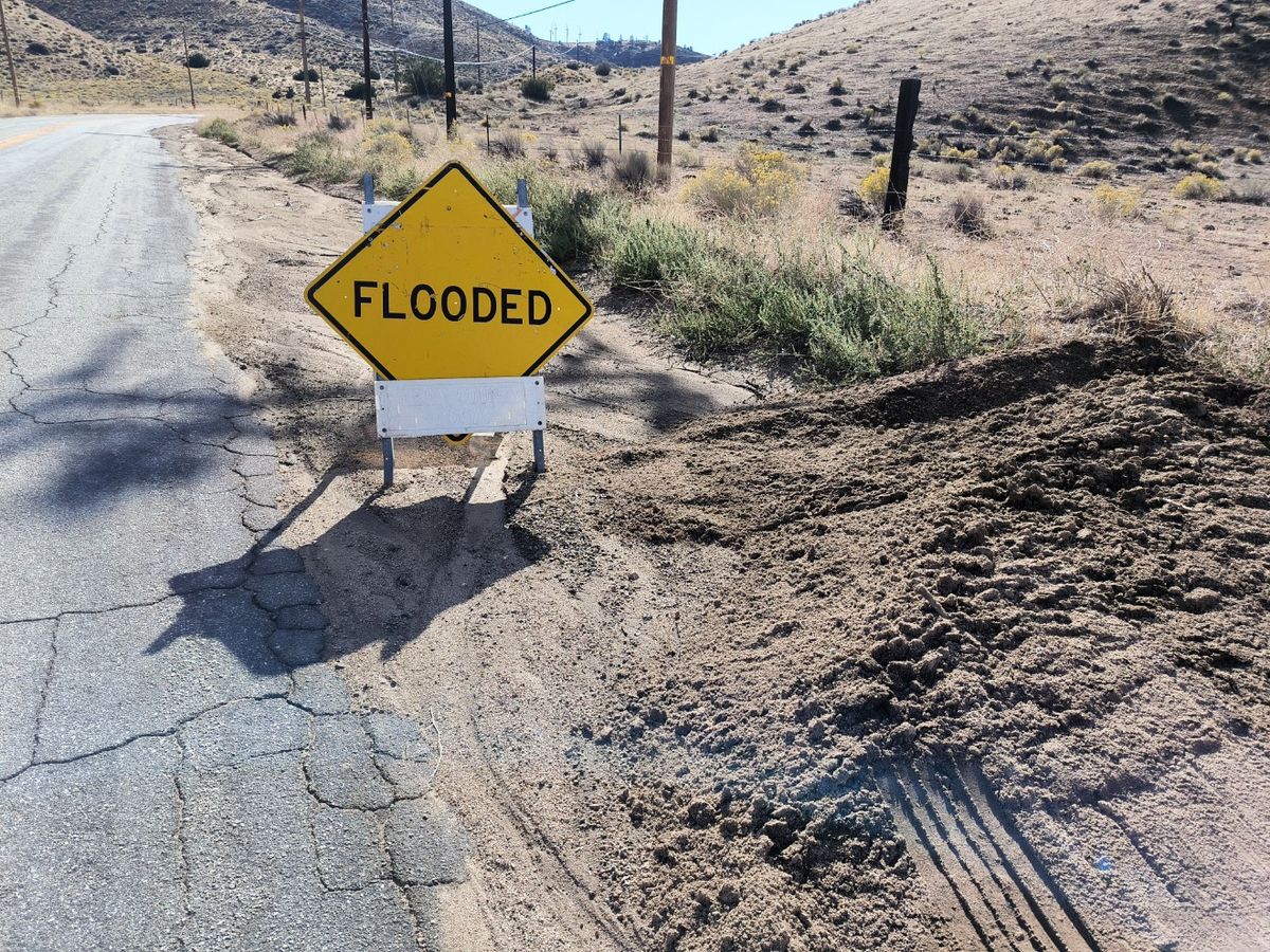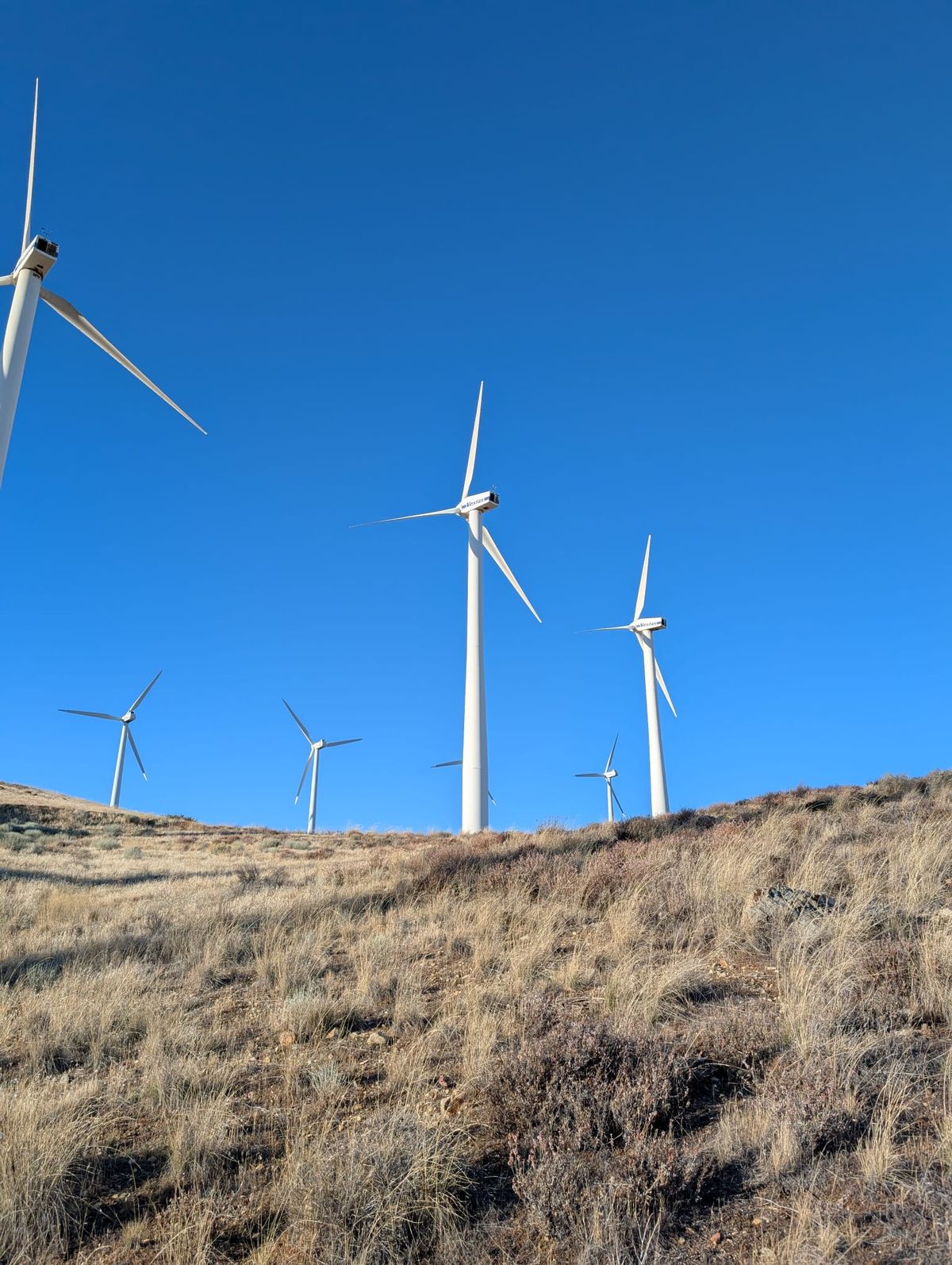 Thomas sieht ein paar größere Tiere, ganz neue Sorte mit grauem Fell. Google Lens sagt : Kalifornischer Maultier-Hirsch. Das würde zu dem Tierkadaver gestern früh am Straßenrand passen. Schon länger haben wir ein Geräusch gehört, das wir gar nicht einordnen konnten. Plötzlich taucht ein Windrad vor uns aus dem Nebel auf. Und dann noch viel mehr, zu allen Seiten stehen Windräder an den Hängen und drehen sich. Das laute Summen der Rotorblätter ist ein ungewohnter Ton in dieser einsamen Natur. Aber wir freuen uns darüber, dass hier mit Windkraft Energie erzeugt wird. Und es kommt noch besser. Östlich von uns liegt der Ort Mojave. Das ganze Tal ist mit Solaranlagen gepflastert, so weit das Auge reicht. Also wird auch die Sonnenenergie ausgiebig genutzt. Sehr schlau. Sonne sollte eigentlich genug da sein in der Wüste – nur heute gerade mal nicht.