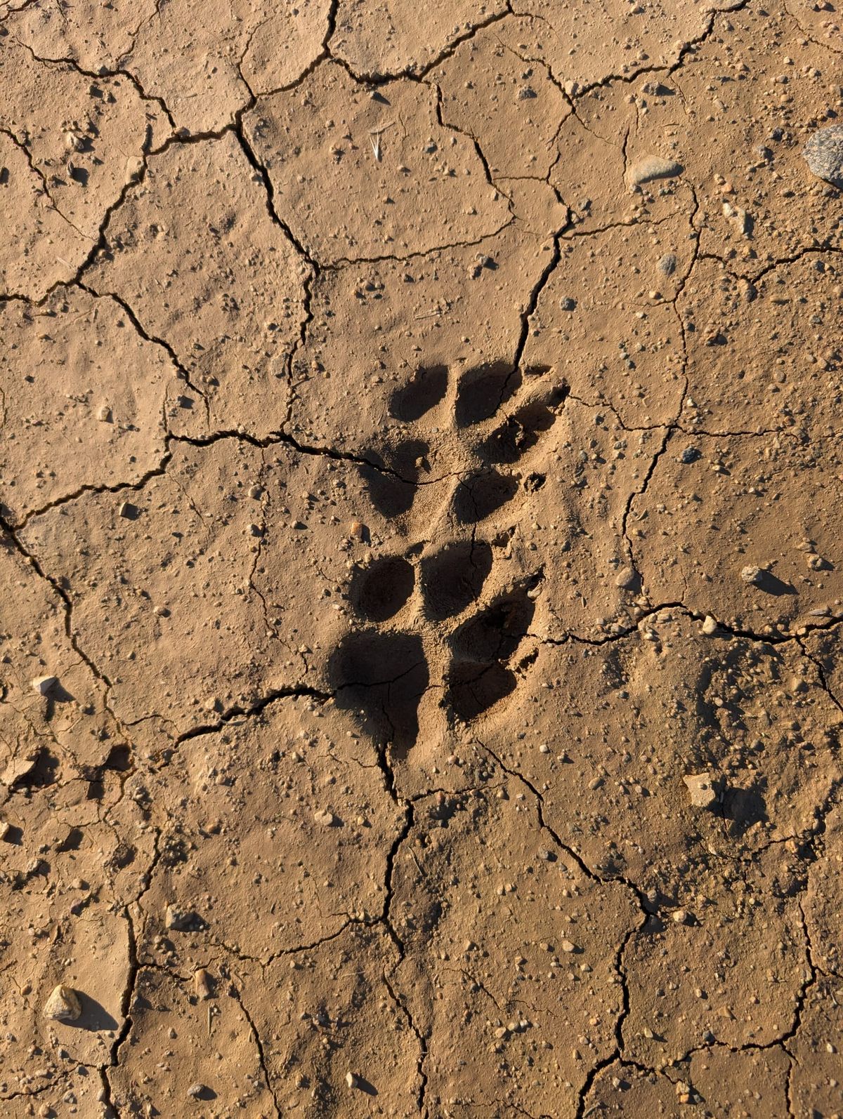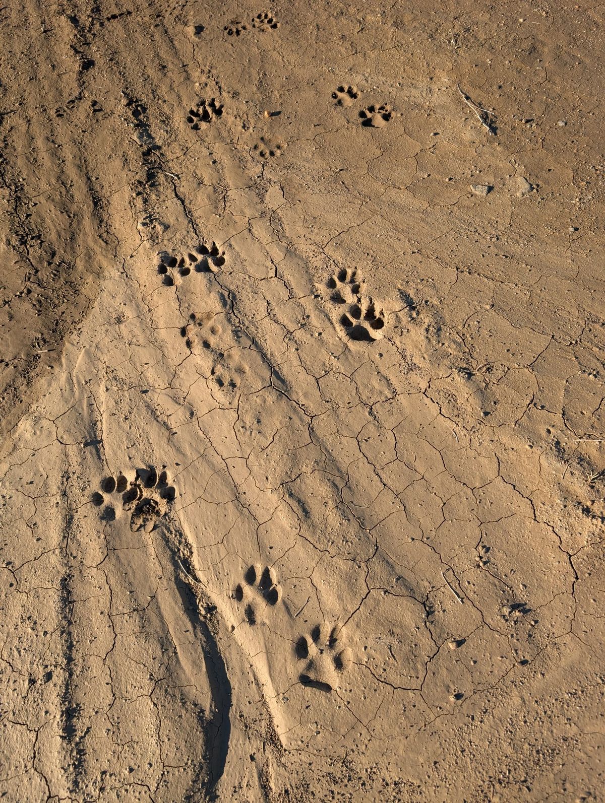 Hikertown ist nur noch 27 Kilometer entfernt. Das wird relativ schnell gehen, wenn wir weiterhin geradeaus auf der Betonröhre marschieren. Das Wetter ist gnädig. Die Sonne scheint zwar, aber der Himmel ist ein bisschen diesig, und es weht ein leichter Wind. Nicht zu heiß. Fast 7 Stunden laufen wir, nur eine halbe Stunde Pause zwischendurch. Es gibt keinen Schattenplatz. Im Sand sind deutliche Abdrücke von Pfoten zu erkennen. Die Spuren sind viel größer als die von Hunden oder Katzen, wahrscheinlich von einem Puma.