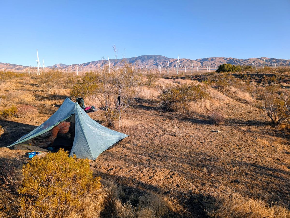 Wir wachen in einem immer noch nassen Zelt auf. Selbst die Schlafsäcke fühlen sich feucht an. Die Isomatte von Thomas hat mächtig viel Luft verloren. Er musste mehrmals während der Nacht aufblasen. Bei einer platten Matratze merkt man die Kälte vom Boden so sehr, dass man davon aufwacht. Draußen ist es neblig, und es weht ein scharfer Wind. Von unseren im Baum aufgehängten Kleidungsstücken ist gar nichts getrocknet. Die Schuhe sind genauso nass wie gestern, nur kälter. Sehr unangenehm beim Anziehen, aber beim Laufen fühlt es sich nur noch halb so schlimm an. Wir hoffen auf Sonne. Falls die sich heute gar nicht blicken lässt, werden wir am Nachmittag nach Tehatchapi aussteigen, denn wir müssen unbedingt das Zelt und unsere Kleidung trocknen.