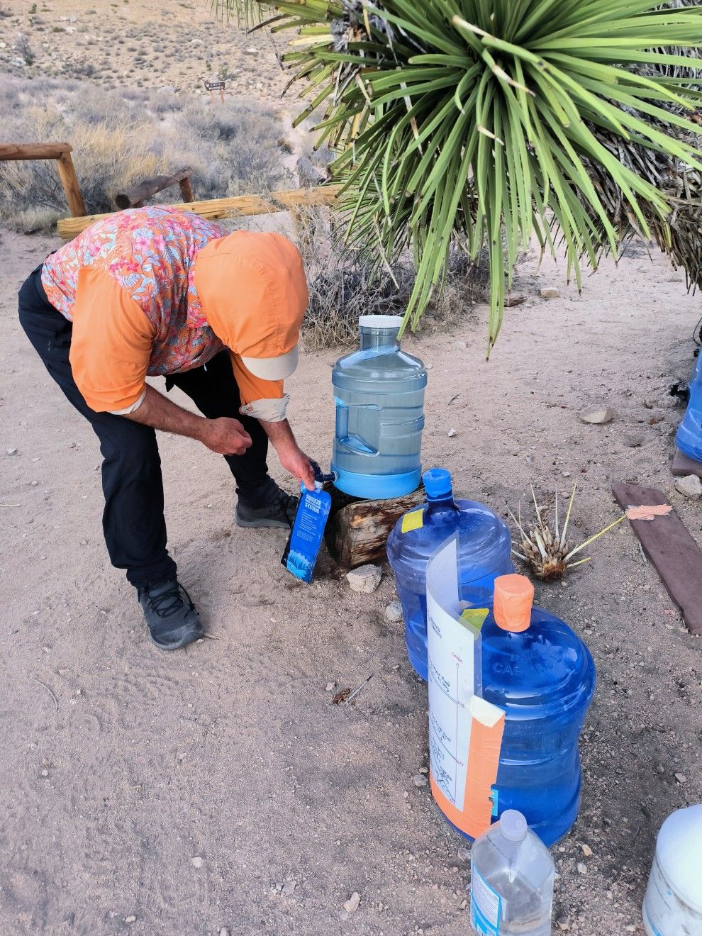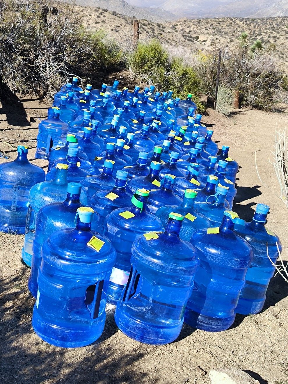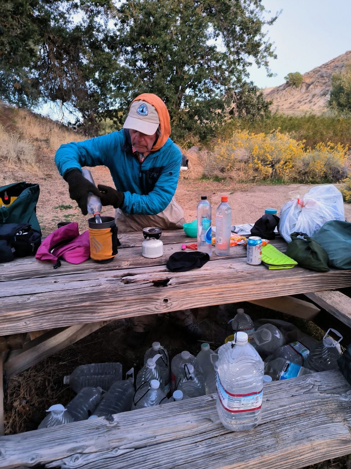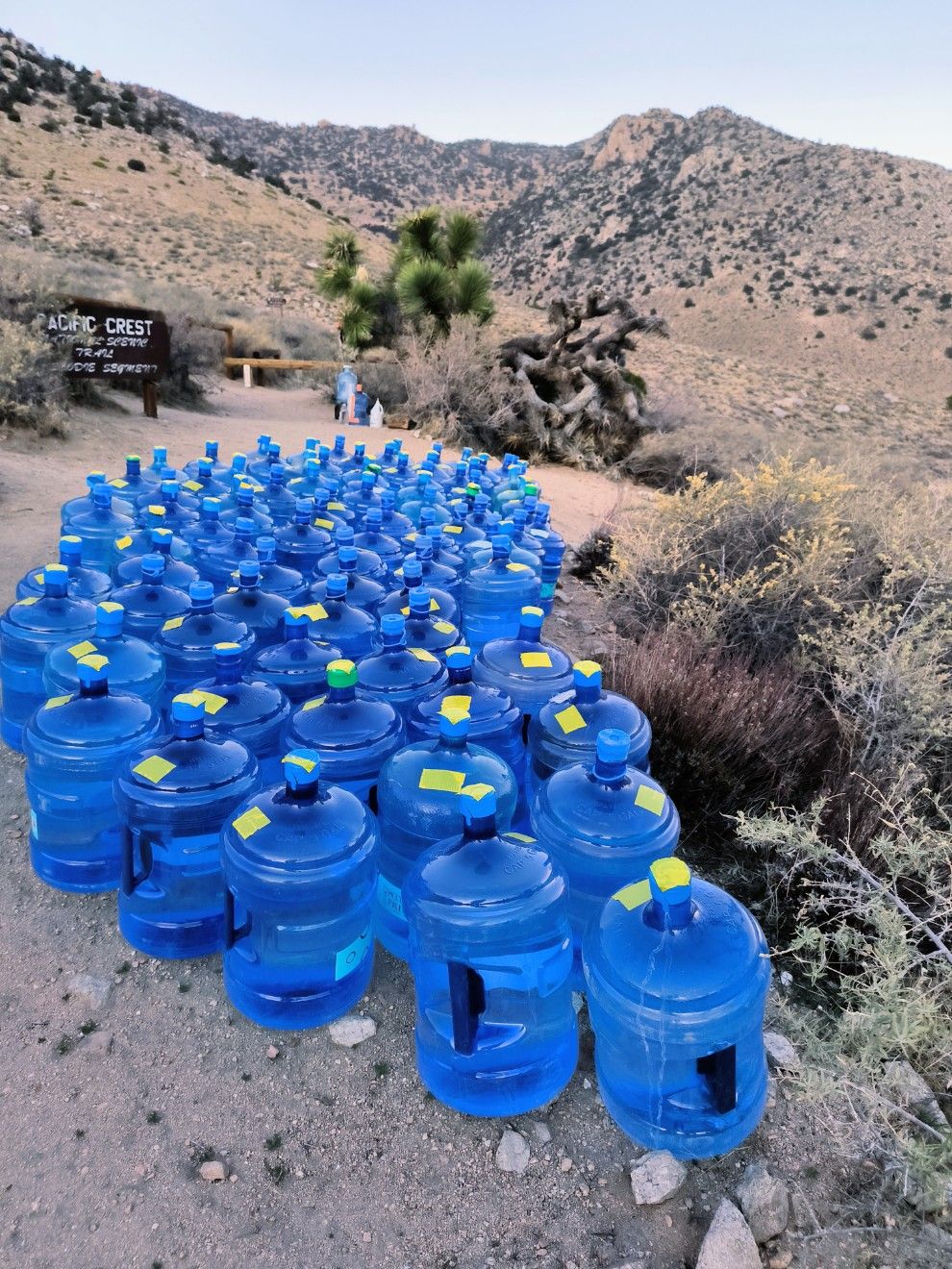 Kurz nach 18.00 Uhr erreichen wir die Schotterstraße am Bird Spring Pass. Schon von weitem leuchtet das Blau der Behälter. Dutzende von Gallonen Wasser haben Trail Angel hier für PCT Hiker bereitgestellt. Das ist so eine große Hilfe ! Unsere App sagt allerdings, dass man sich nicht auf die „water caches“ verlassen darf. Ja, wie soll das denn sonst gehen ? Das nächste Wasser ist ebenfalls ein Depot und weitere 25 Kilometer entfernt. Dazwischen nichts. Ach, doch …. Es gibt einen Abzweiger, wo ein halber Wassertropfen verzeichnet ist. Halber Wassertropfen bedeutet „nicht zuverlässig“. Die lustigen Anweisungen dazu lauten : Wenn die Wasserquelle trocken ist, dann soll man dort ein tiefes Loch graben und warten, bis sich darin Wasser sammelt. Die spinnen doch ! Man muss also einen Umweg über einen Seitenweg machen, ein Loch buddeln und warten …. Da fragt man sich, ob diese Leute jemals länger als einen Tag auf dem Trail waren. Völlig unrealistisch. Also wenn es an der einen oder anderen Stelle nichts gibt, dann kann man sich eigentlich nur an die Straße stellen und per Anhalter irgendwohin fahren.