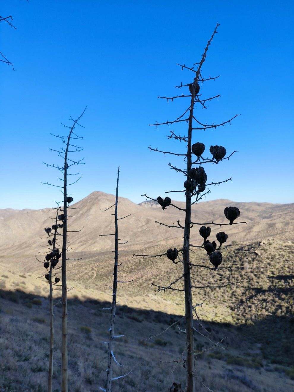 Dunkle Wolken am Himmel. Thomas hat sich für die Wüste schlechtes Wetter gewünscht, und das scheint auch zu klappen. Ein riesiges Tiefdruckgebiet rollt von Süd-Westen in unsere Richtung. Es bedeutet wahrscheinlich Regen und kalte Nächte in der nächsten Woche. Schlimmer werden die Hiker in den Sierras dran sein. Die könnte es wirklich böse erwischen in den hohen Bergen. Wir haben hier zwar auch Hügel, die sind aber durchweg ein paar Hundert Meter tiefer. Heute liegen 33 Kilometer vor uns bis zum nächsten Wasser am Bird Spring Pass. Das wird dann wohl auch unser Endziel am Abend sein. Bis zum Wasser müssen wir es schaffen, denn sonst können wir nicht kochen. Die Distanz ist völlig ausreichend, außerdem stecken 1150 Höhenmeter Aufstieg mit drin.