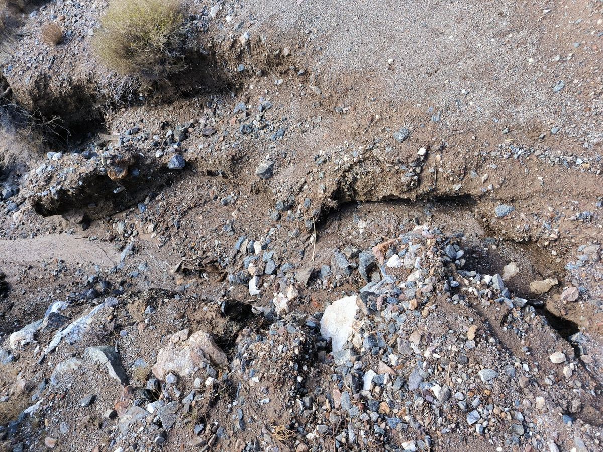 Ein Blick ins Höhenprofil zeigt uns, dass wir bis zur Pause 500 Höhenmeter Aufstieg und 700 Abstieg zu erwarten haben. Es sind 20 Kilometer bis zum nächsten water cache, also müssen wir 3 Liter tragen. Wir starten bergauf, dabei wird es einem normalerweise schnell warm. Mehrere Kilometer stolpern wir auf einer Piste mit tiefen Furchen, die der gestrige Regen ausgewaschen hat. Dazwischen Geröll und Matsch, der an den Schuhen klebt. Da ist nur langsames Vorwärtskommen möglich, so gerne wir auch diese unwirtliche Gegend verlassen möchten. Irgendwie ist das gerade weit außerhalb unserer Komfortzone. Nach gut zwei Stunden bekommt der Trail Ähnlichkeit mit einer Straße. Allerdings war diese wohl gestern überflutet, heute stehen immer noch tiefe Pfützen in den Senken und versperren den Weg. Pause gibt es nicht, es ist viel zu kalt. Der dichte Nebel und der Wind, der uns von vorne um die Ohren weht, treiben uns an.