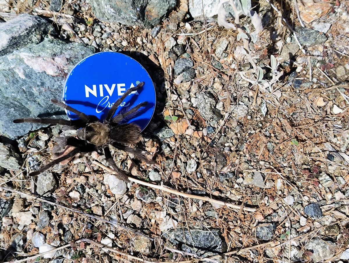 Die letzten 3 Kilometer laufen wir parallel zum Highway 58. Eine Riesenspinne krabbelt vor mir her. Die ist wirklich groß, ungefähr 10 Zentimeter im Durchmesser und ziemlich haarig. Bei Tageslicht und mit Abstand betrachtet ganz interessant. Wenn die mir aber im Dunkeln begegnen oder mir zu nahe kommen würde …. Ich bin eigentlich Spinnenfreund und trage die vorsichtig nach draußen, aber diese hier würde ich lieber hinter einer Glasscheibe sehen.
