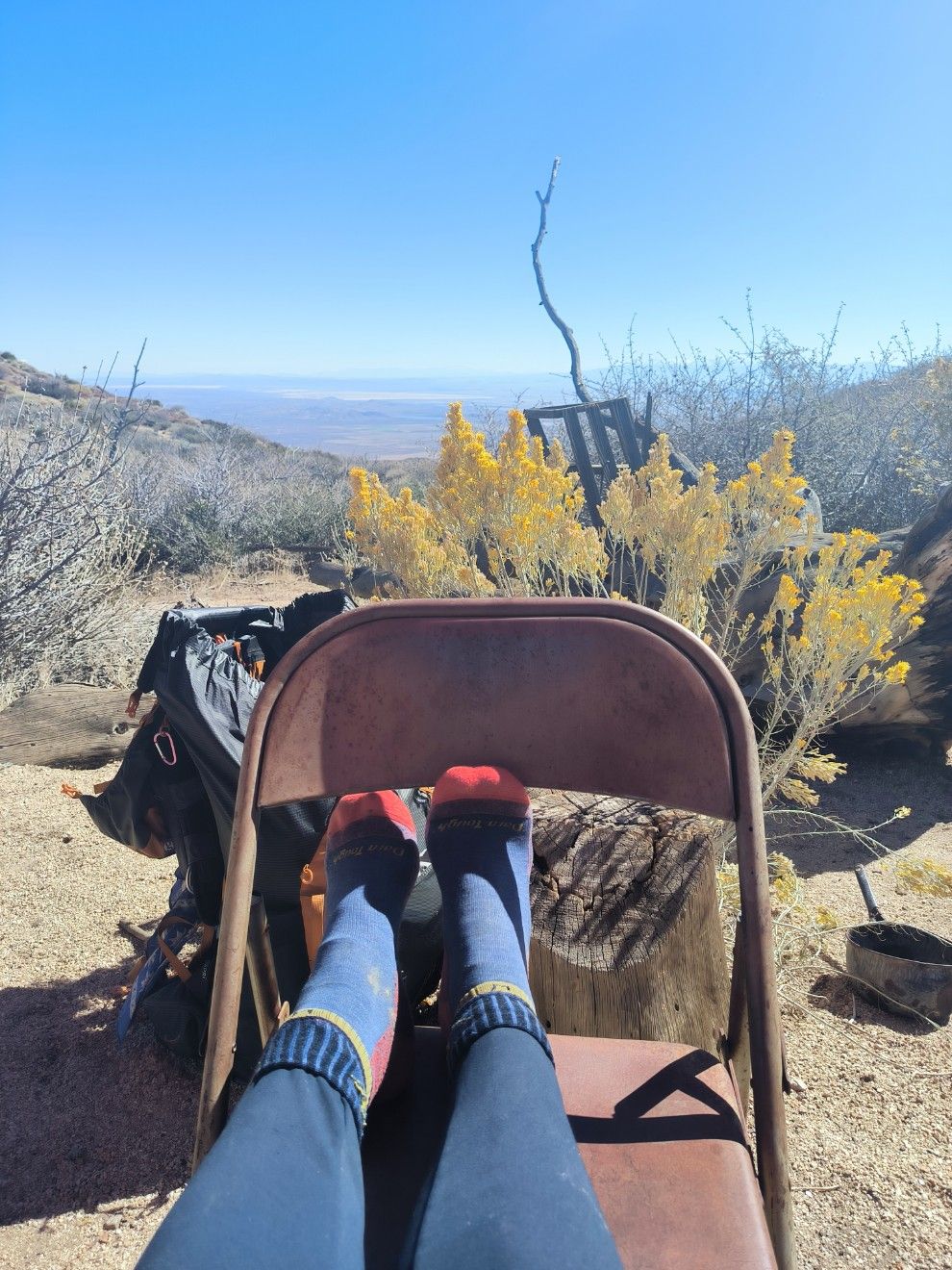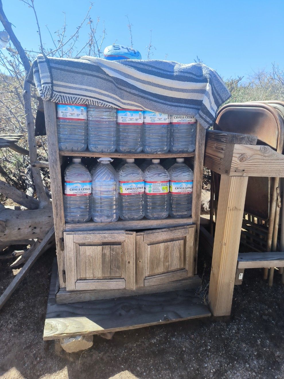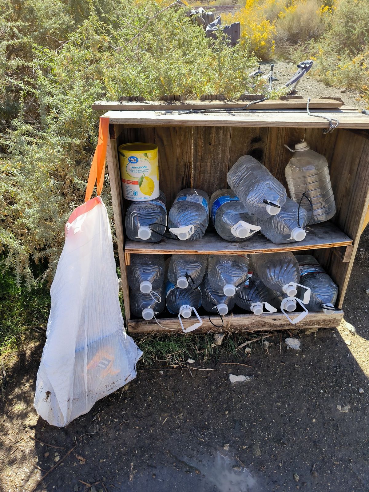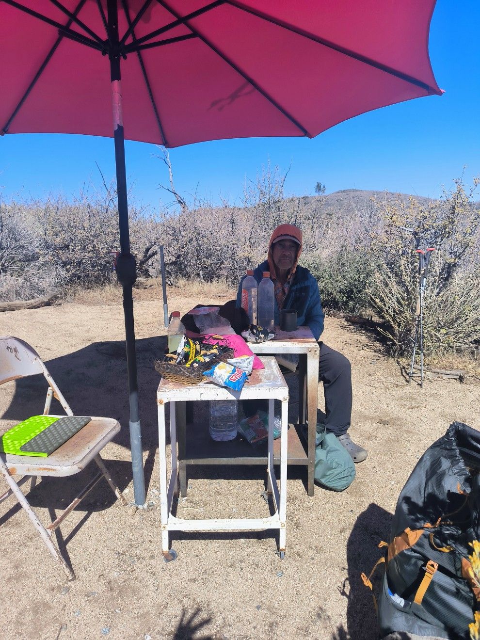 Es liegen 15 Kilometer vor uns bis zu einem Platz, an dem vielleicht Wasser steht. Die Kommentare in unserer App sagen, dass gestern nichts mehr da war. Das haben wir heute früh erst gelesen und waren schockiert. Würde bedeuten, dass wir 47 Kilometer mit je einem Liter auskommen müssen. Schon von weitem entdecken wir ein paar bunte Flecken in der Landschaft. Beim Näherkommen zeigt sich ein nettes Arrangement aus Campingstühlen, Tischen, Sonnenschirm. Es gibt mehrere Schränke mit überraschendem Inhalt wie 3-Minuten-Nudeln, kleine Tüten Chips, Tampons, Spiele, Bücher. Und Wasser ! 30 Gallonen Wasser, das sind über 100 Liter, wurden heute früh vom Trail Angel aufgefüllt. Das rettet uns den Tag und macht den Weg durch die Wüste leichter. Super Platz für eine lange Pause unter’m Sonnenschirm. Fast wie im Café. 🙂 Als Zugabe gibt es einen unverbauten Blick auf das Tal mit seinen Salz-Seen und die mit Schnee bedeckten Berge. Einfach fantastisch ! Und es zeigt mal wieder, wie schnell sich das Blatt wenden kann. Gestern noch „keine Lust mehr“ und heute das pure Glück. 🙂 Für den weiteren Weg nehmen wir 4 Liter Wasser mit. Zum Schluss werfen wir 5,- Dollar in die Spendendose. Das Geld wird wahrscheinlich den nächsten Hikern zugute kommen.