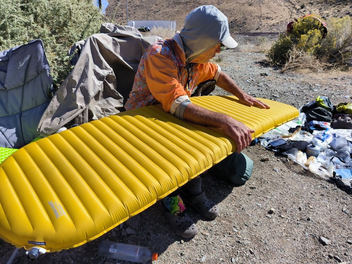 Während der Nacht hat die Isomatte von Thomas wieder Luft verloren. Nicht so viel wie vor der Reparatur, sie musste aber doch mehrmals wieder aufgeblasen werden. Vielleicht ist noch ein weiteres Loch drin, oder die behelfsmäßige Reparatur ist nicht perfekt gelungen. Da muss man nacharbeiten. Flickzeug haben wir genügend dabei.