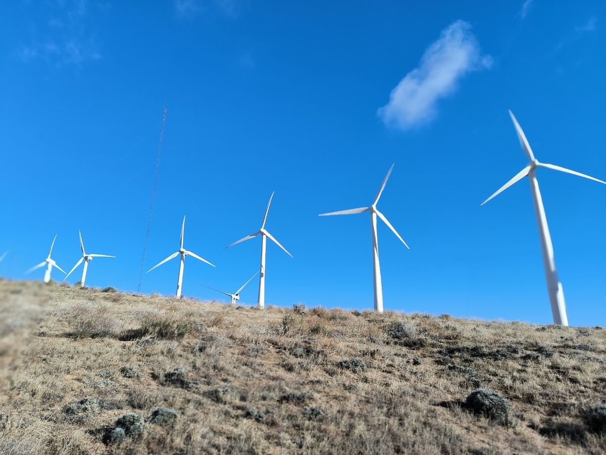 Tatsächlich sieht es bis um 11.00 Uhr nur grau aus, zwischendurch fallen sogar ein paar Schneeflocken. Dann sind wir über den höchsten Punkt hinaus und beginnen mit dem Abstieg. Die Wolken lichten sich, es wird heller und etwas wärmer. Wir haben die Klimazone der Joshua Tree Palme erreicht. Von oben können wir einen kleinen Ort, einen Flughafen, Bahngleise und eine große Straße mit viel Verkehr erkennen. Und Windräder. Mehr, als man sich vorstellen kann. Auf jedem Hügel stehen welche. Es wirkt etwas futuristisch, aber noch nicht einmal störend in dieser kargen Landschaft.