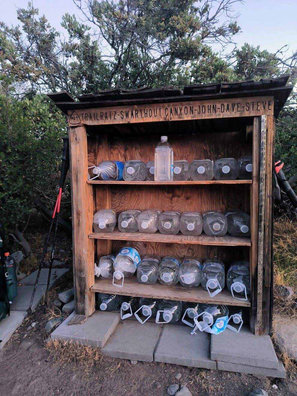 Kurz vor Einbruch der Dunkelheit erreichen wir eine Straße, an der es Unmengen von Trinkwasser gibt. Dieser Trail Angel hat das Depot gestern erst aufgefüllt. Außerdem stehen dort einige Stühle, damit die durstigen Hiker sich ausruhen können. Wir suchen und finden einen Zeltplatz ganz in der Nähe. Drei Stühle leihen wir uns aus und stellen sie vor’s Zelt, damit wir beim Abendessen bequem sitzen können. Das wird ein schönes Picknick unter’m Sternenhimmel. 🙂 Seit heute Mittag 1800 Höhenmeter im Abstieg. So viel hatten wir noch nie an einem Stück. Bin mal gespannt, wann wir die wieder aufsteigen müssen.
