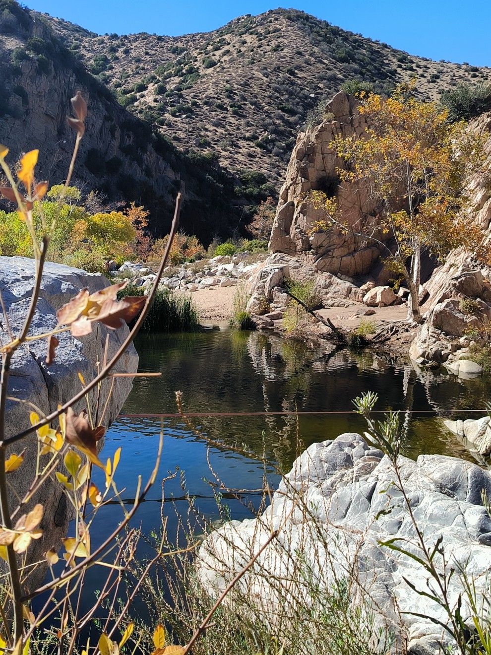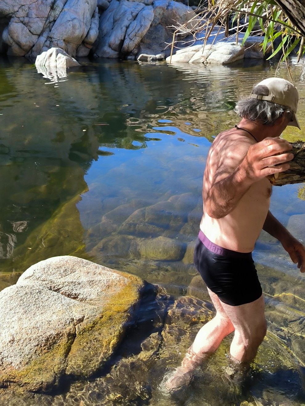 Pause gibt es nach 15 Kilometern am Deep Creek. Von da aus steigen wir an einer steilen Wand in die Höhe. Harte Nummer in der Mittagshitze. So haben wir lange nicht geschwitzt. Endlich wieder Natur pur. Keine Straßen, keine Schienen und keine Häuser in Sicht. Wir folgen dem Verlauf des Deep Creek. Auf einem schmalen Band laufen wir immer an den Felsen entlang. Sehr schön. Wir bleiben oberhalb des Flusses und hören das Wasser rauschen. Zugang dazu haben wir nicht, denn es ist viel zu steil und viel zu tief bis unten in die Schlucht. Direkt am PCT liegen natürliche Hot Springs. Da ist eine Menge los, obwohl es gar kein Wochenende ist. Auf den ersten Blick zählen wir etwa ein Dutzend Menschen. Ein paar Hiker, die wir in den letzten Tagen um uns hatten, sind auch hier.