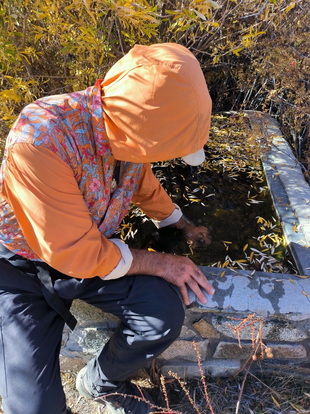 Am frühen Nachmittag erreichen wir die Little Bear Spring, wo sogar ein Picknicktisch steht. Das schreit ja nach einer ausgiebigen Pause. Wir hatten eine Quelle erwartet, die aus einem Rohr plätschert. Stattdessen sieht das Wasser im Steintrog auf den ersten Blick gar nicht so attraktiv aus. Ein paar Algen am Grund und an den Wänden, die Oberfläche ist mit Blättern in bunten Herbstfarben bedeckt. Aber wenn man es vorsichtig entnimmt, dann ist das Wasser herrlich klar und eiskalt. So sauber, dass wir es ungefiltert trinken können. Sehr schön. 🙂 Vorsichtshalber nehmen wir drei Liter Wasser mit, weil wir noch nicht wissen, wo wir zu liegen kommen. Wir tragen zwar nicht gerne, aber damit sind wir heute Abend unabhängig bei der Wahl des Platzes. Außerdem sind die Proviantbeutel inzwischen auffällig leicht geworden. Wir haben bereits 900 Höhenmeter geschafft. Da bleiben ja nur noch 400 für den Rest des Tages. Das fühlt sich gut an.