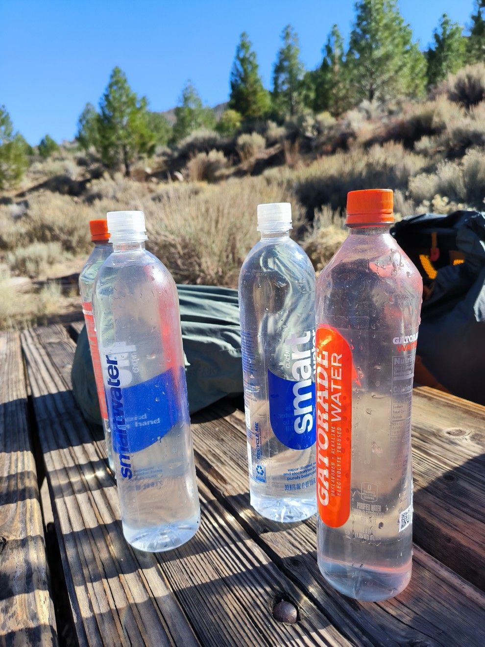 Der PCT verläuft eine kurze Strecke neben dem Highway. Am Rande der Fahrbahn liegt unheimlich viel Müll, besonders leere Bierdosen und Flachmänner. Richtig hässlich. Es gilt eine Höchstgeschwindigkeit von 80 Kilometern pro Stunde. Schnell genug, um Tiere tot zu fahren. Wir sehen ein schwarz-weißes Fellbündel am Straßenrand, was vermutlich mal ein niedliches Hündchen gewesen ist. Etwas weiter dann noch ein Stück braunes Fell, es sieht ebenfalls nach Hund aus. 🙁 Ein Auto kommt von hinten, wendet und hält an. Der Fahrer drückt jedem von uns eine Flasche Wasser in die Hand. Das macht Freude, so etwas erlebt man natürlich nur neben der Straße.