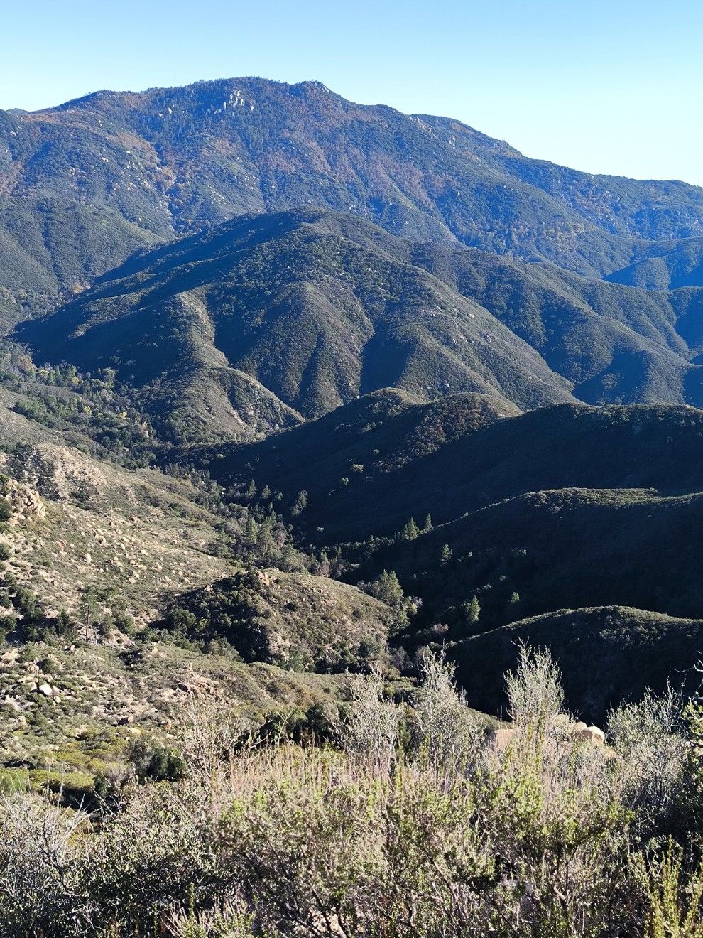 Am späten Nachmittag laufen wir auf einem seitlichen Abzweiger hinunter bis zur Cleghorn Picnic Area. Da liegt ein stattlicher Bärenhaufen neben den Picknick-Tischen, der ganz sicher von einem ausgewachsenen Bären stammt. Bisher waren es immer eher kleine Exemplare, wenn wir Spuren gesehen haben. Das ganze Erholungsgebiet ist abgesperrt und mit Verbotsschildern bestückt. Hier hat es großflächig gebrannt, und das kann noch gar nicht so lange her sein. Es ist überhaupt keine neue Vegetation zu sehen, bisher wächst nicht ein einziger Halm. So etwas wirkt immer ziemlich trostlos. Es gibt einen funktionierenden Wasserspender, obwohl der Park zur Zeit gar nicht genutzt werden darf. Darauf hatten wir gehofft und füllen alle unsere Flaschen. Das Wasser schmeckt gechlort, sind wir gar nicht gewohnt. Wir tragen zwei Stunden lang die volle Ladung und laufen damit bis in die Dunkelheit. Oberhalb des Silverwood Lake finden wir ein Plätzchen für die Nacht. Die Luft ist mild. Wir können draußen kochen und essen, ohne zu frieren.